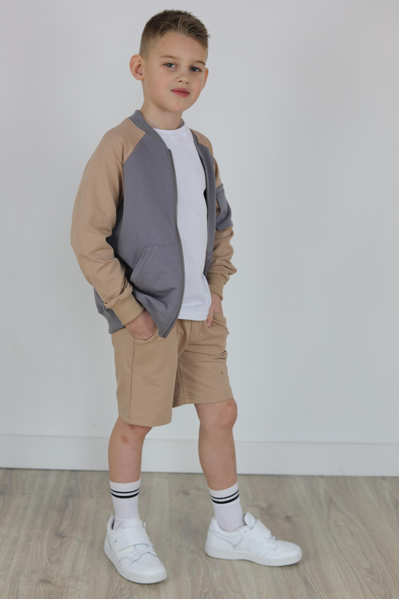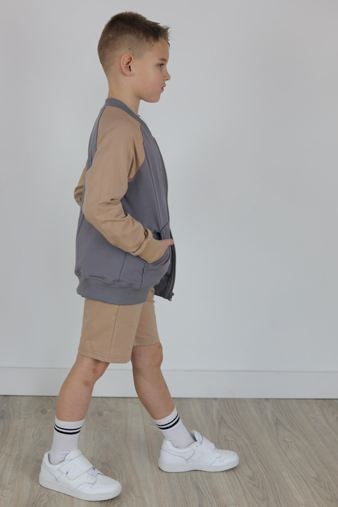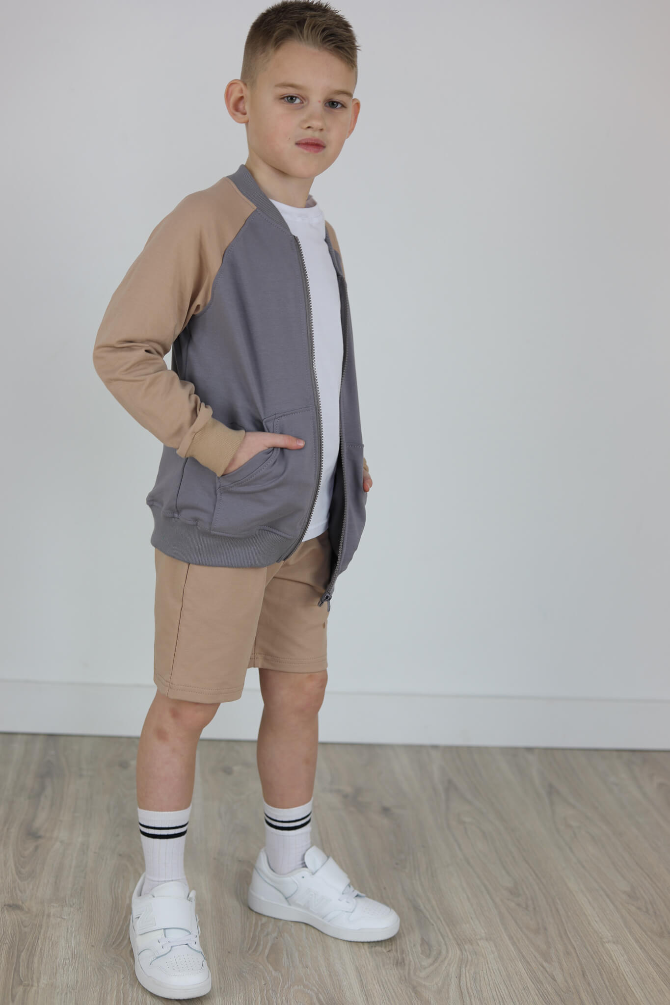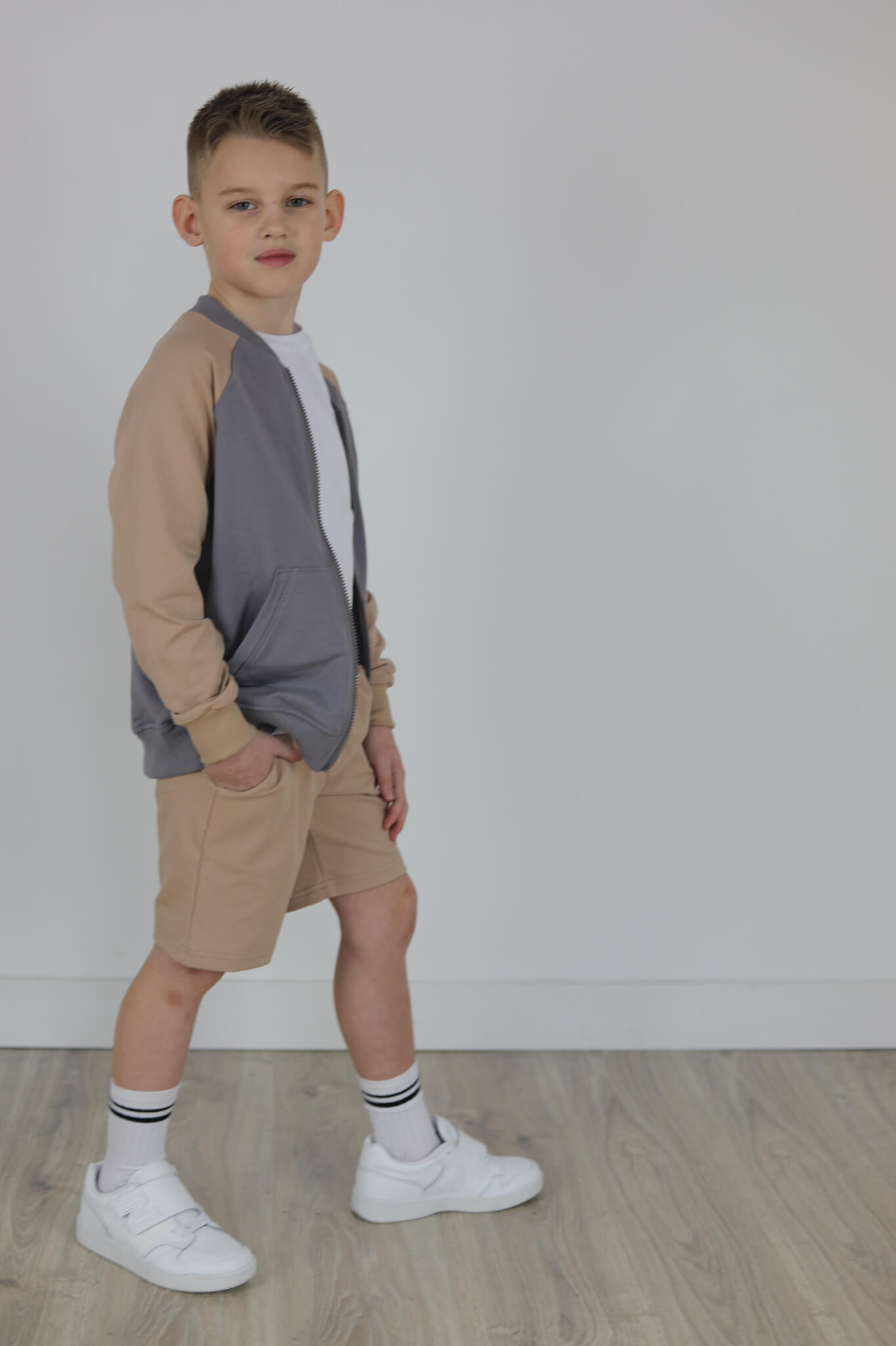 SPODENKI KLASYK z minimalistycznymi szwami z lekko obniżonym krokiem, nogawka trochę dłuższa aby spodenki nadawały się do szkoły i przedszkola wczesną wiosną.