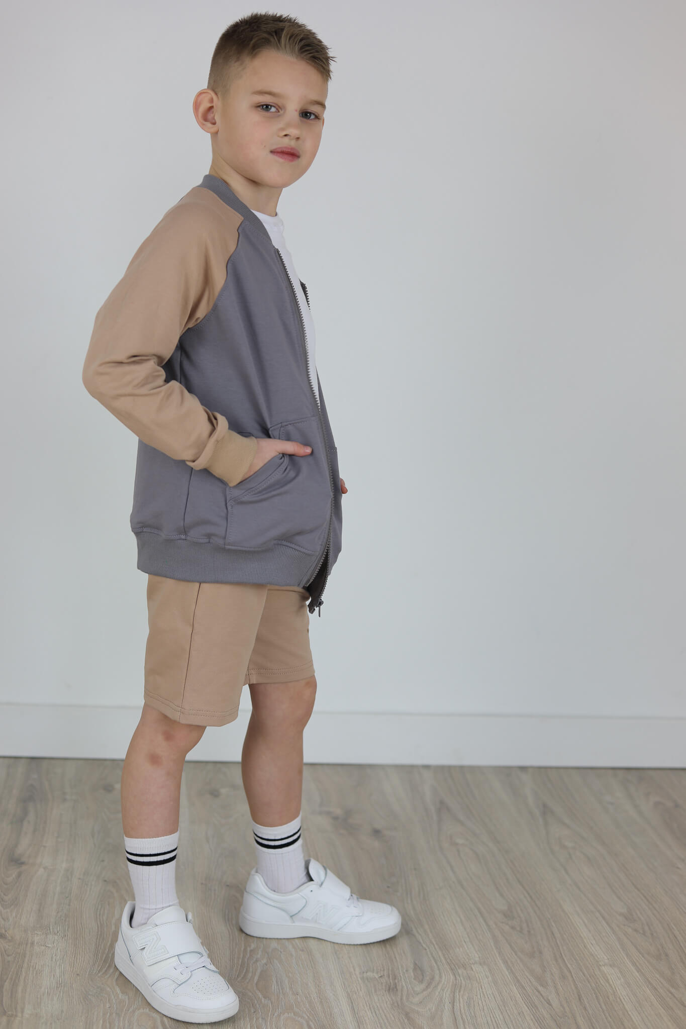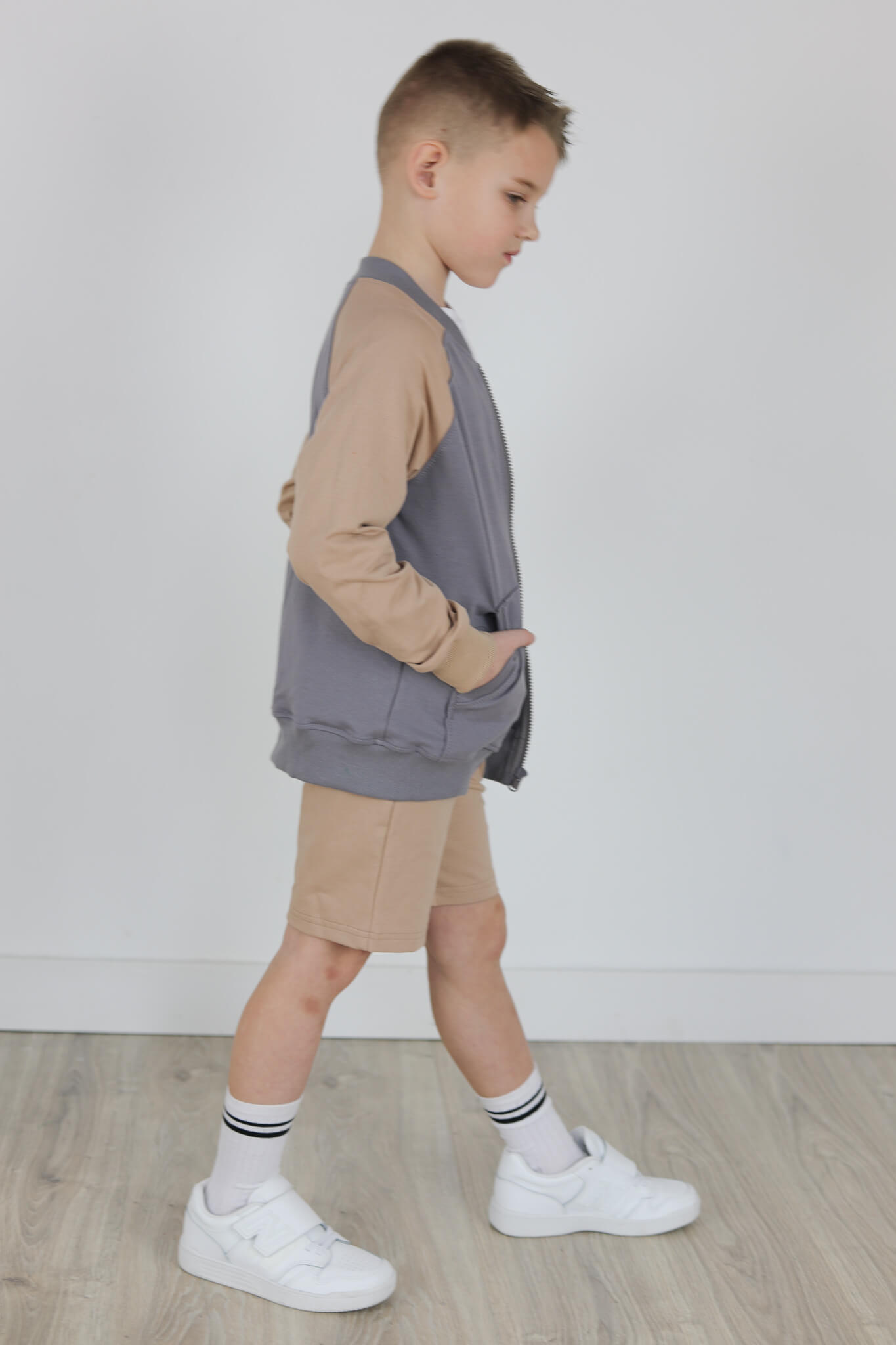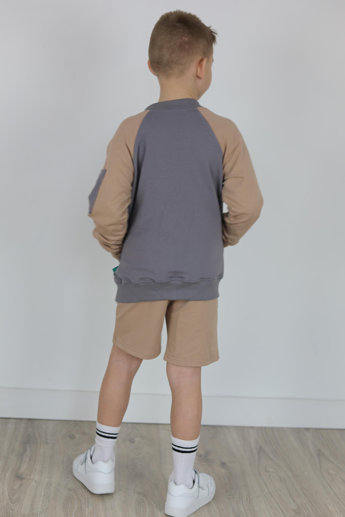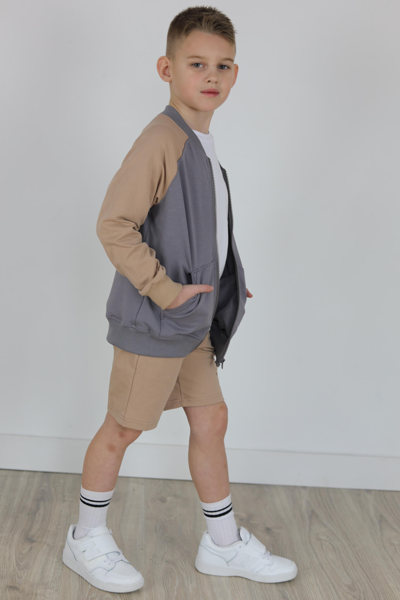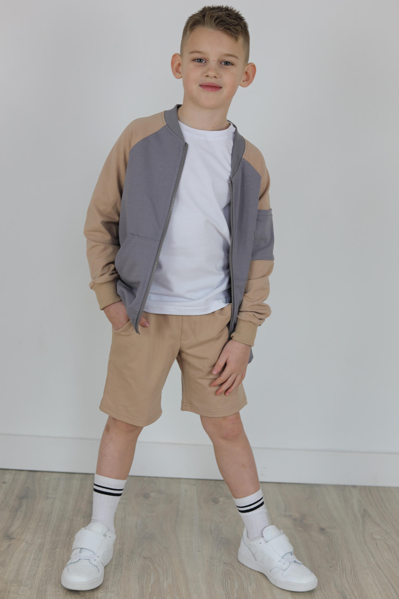 SPODENKI KLASYK z minimalistycznymi szwami z lekko obniżonym krokiem, nogawka trochę dłuższa aby spodenki nadawały się do szkoły i przedszkola wczesną wiosną.