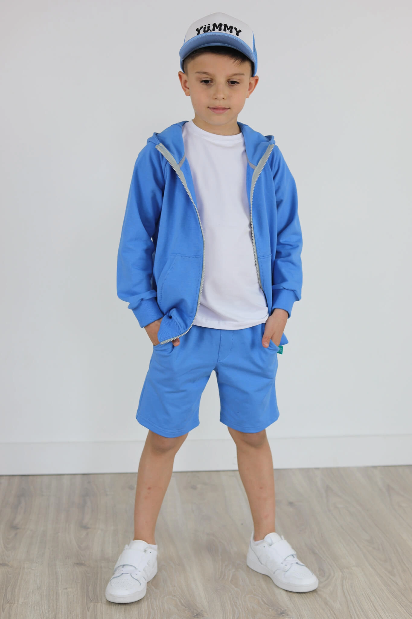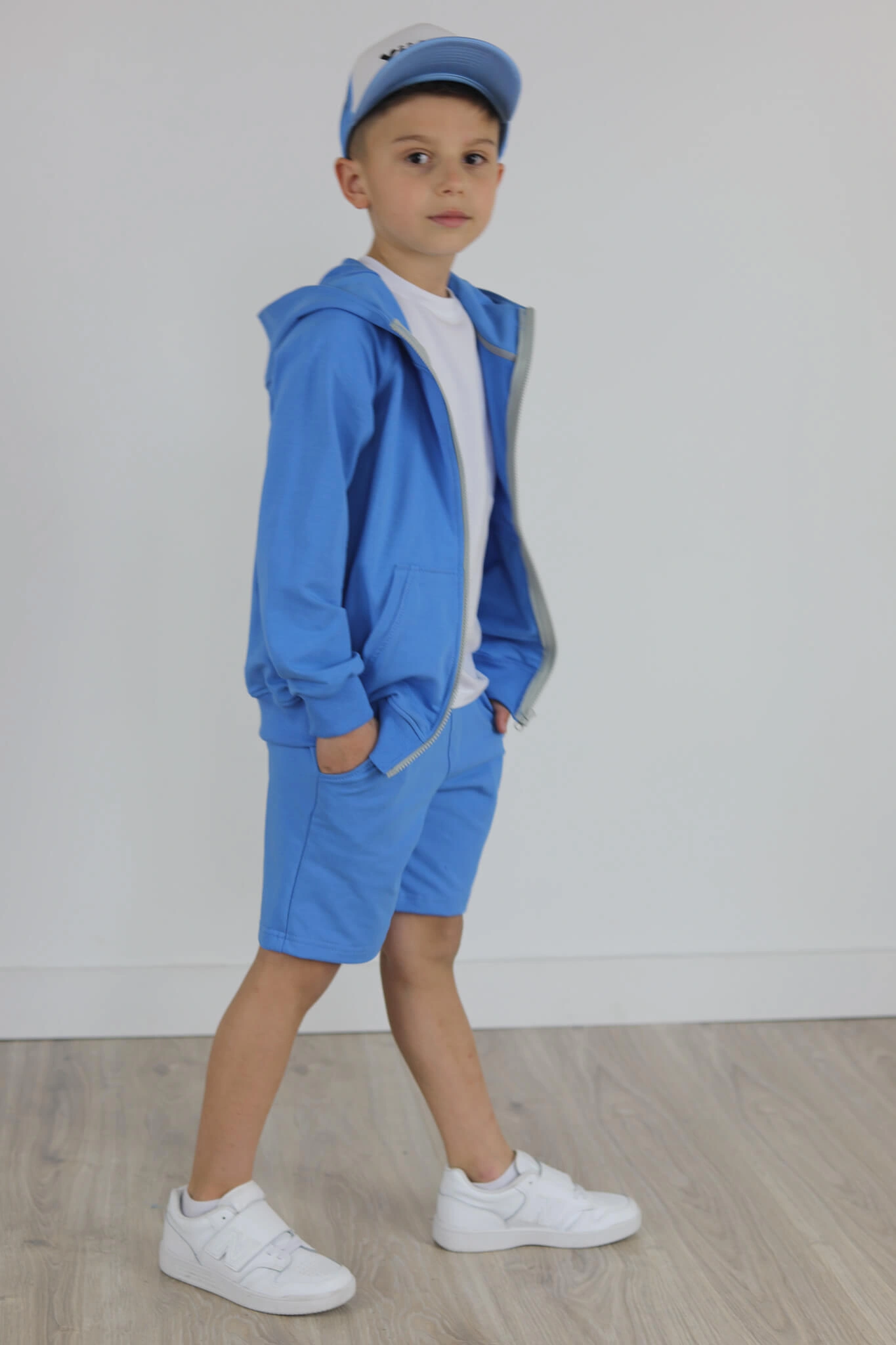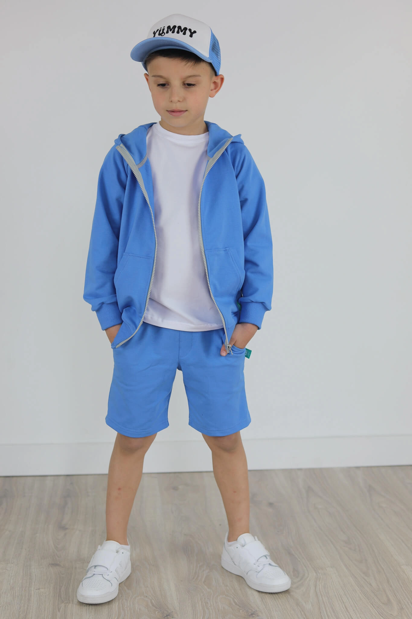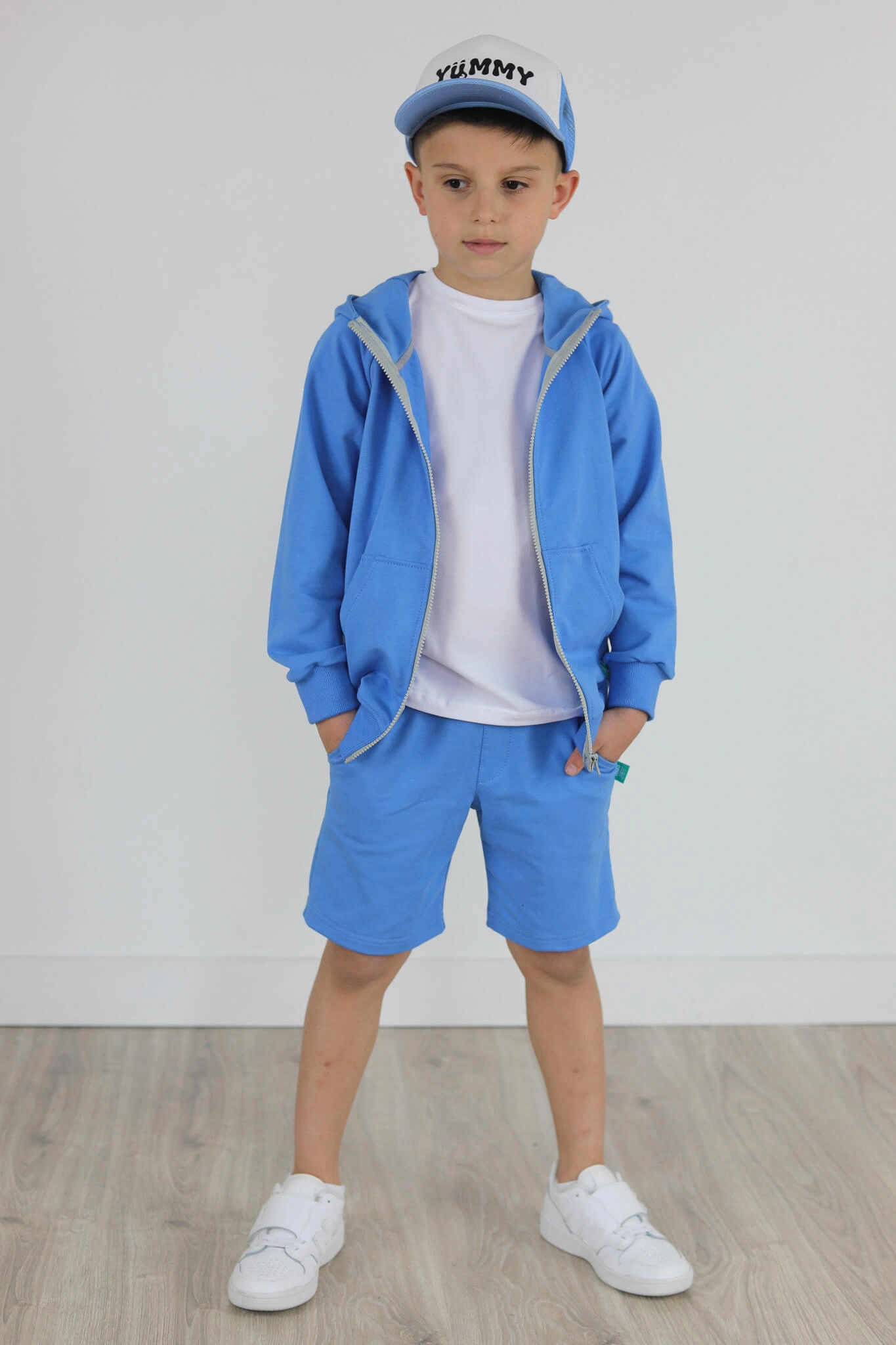 SPODENKI KLASYK z minimalistycznymi szwami z lekko obniżonym krokiem, nogawka trochę dłuższa aby spodenki nadawały się do szkoły i przedszkola wczesną wiosną.