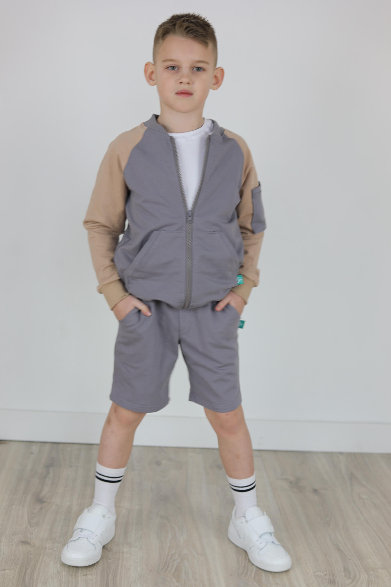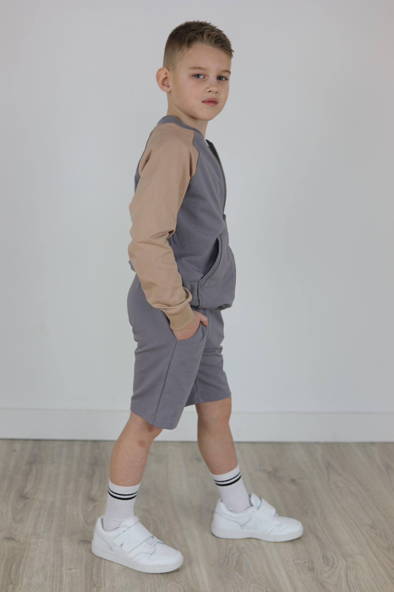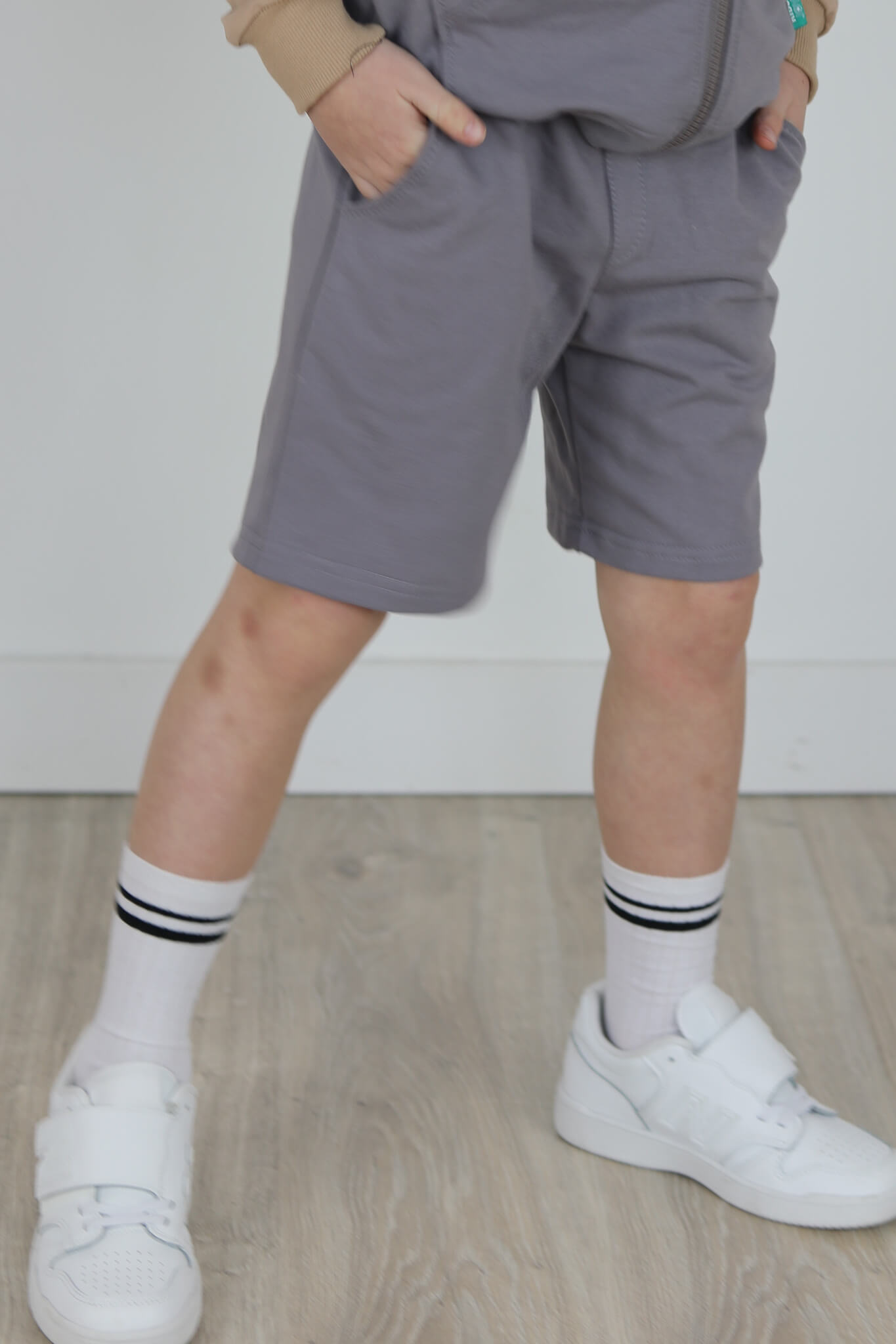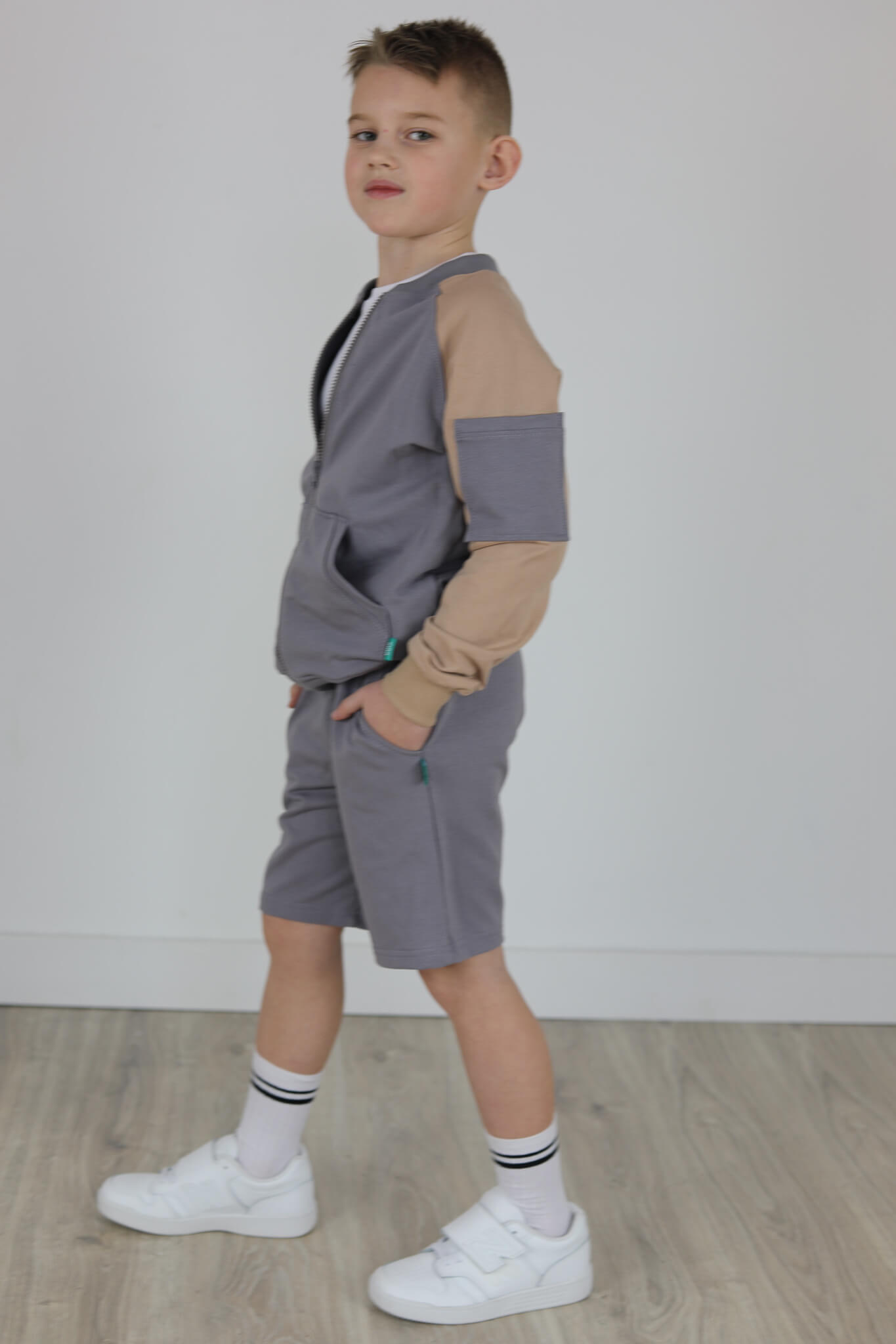 SPODENKI KLASYK z minimalistycznymi szwami z lekko obniżonym krokiem, nogawka trochę dłuższa aby spodenki nadawały się do szkoły i przedszkola wczesną wiosną.