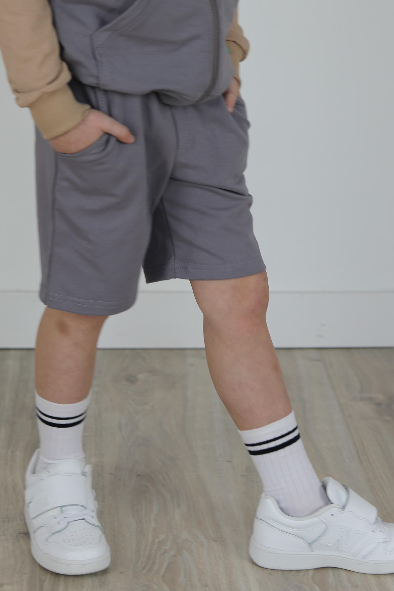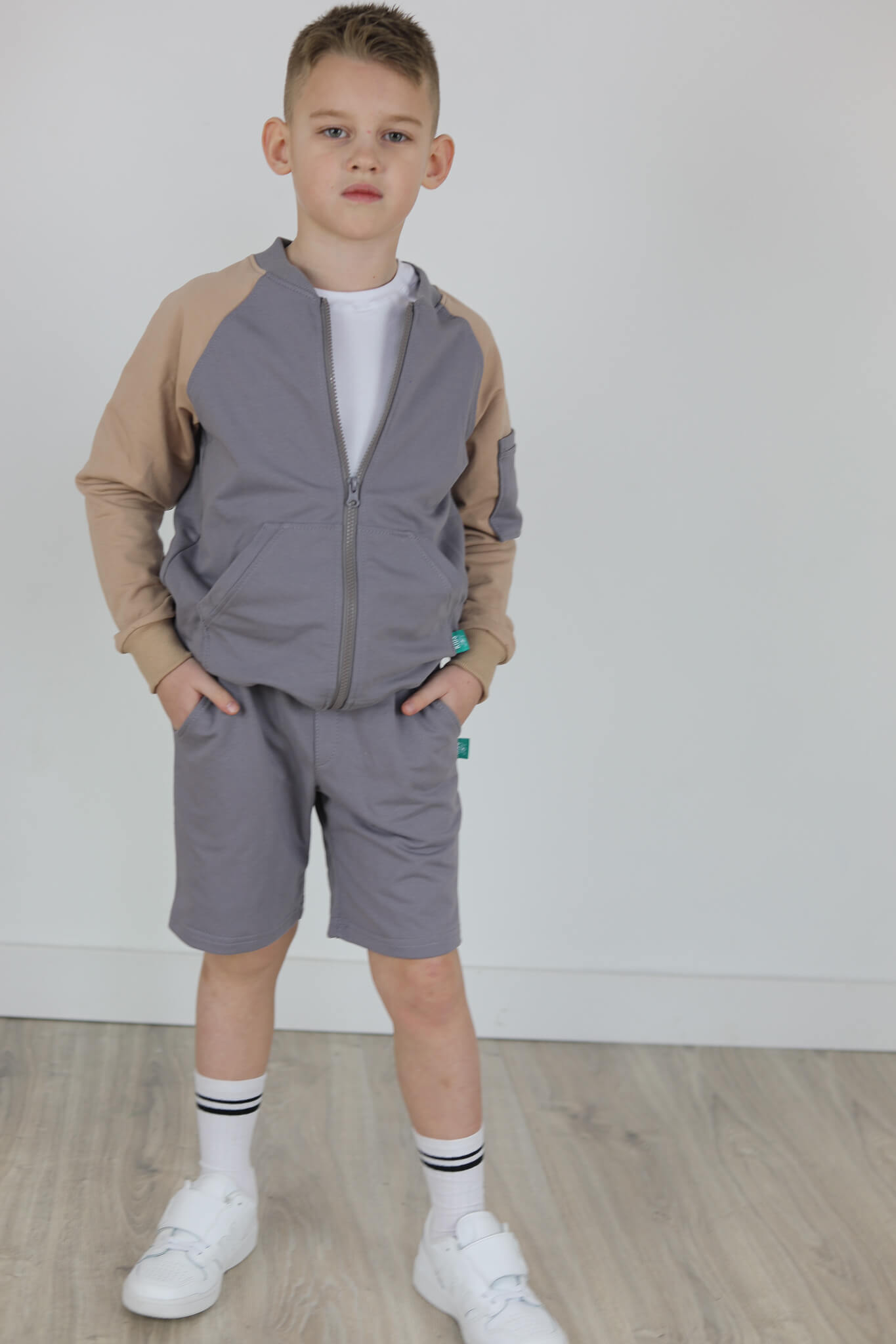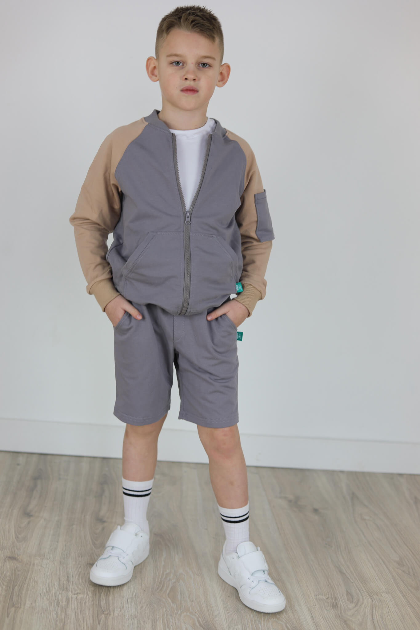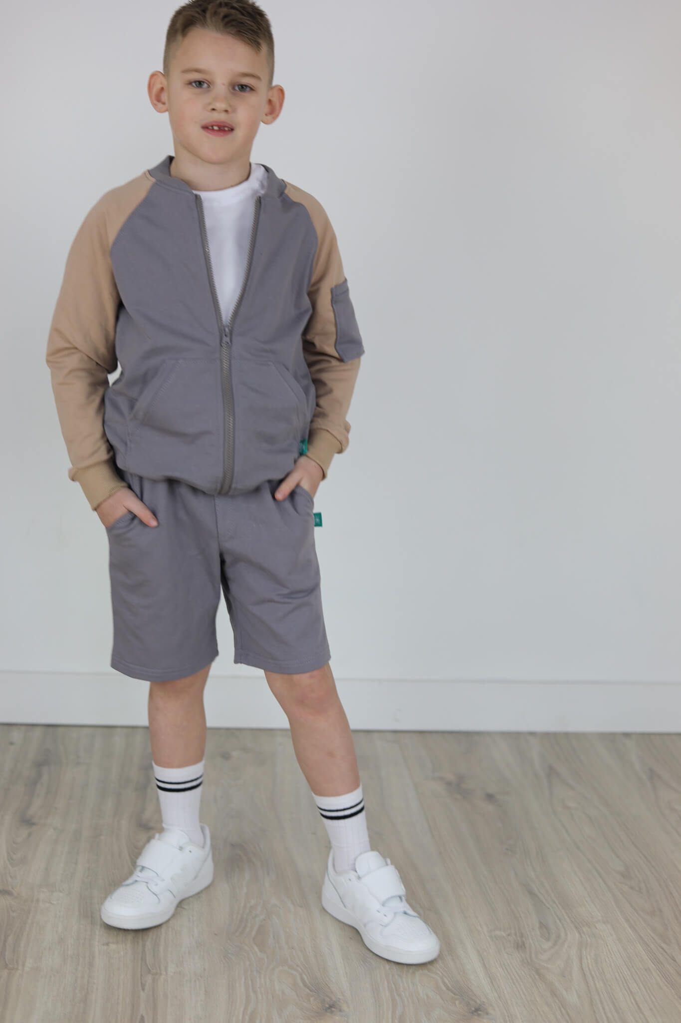 SPODENKI KLASYK z minimalistycznymi szwami z lekko obniżonym krokiem, nogawka trochę dłuższa aby spodenki nadawały się do szkoły i przedszkola wczesną wiosną.