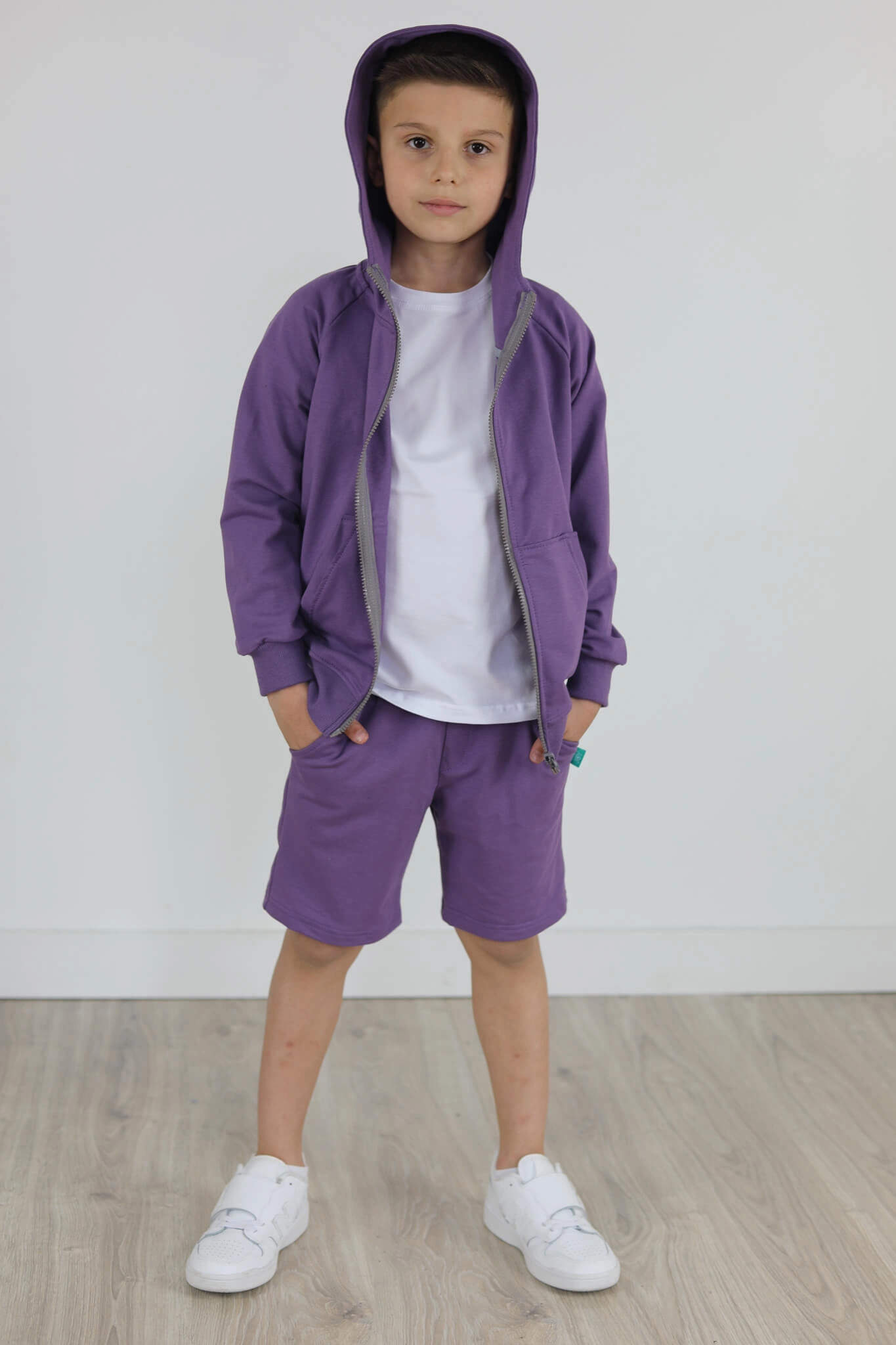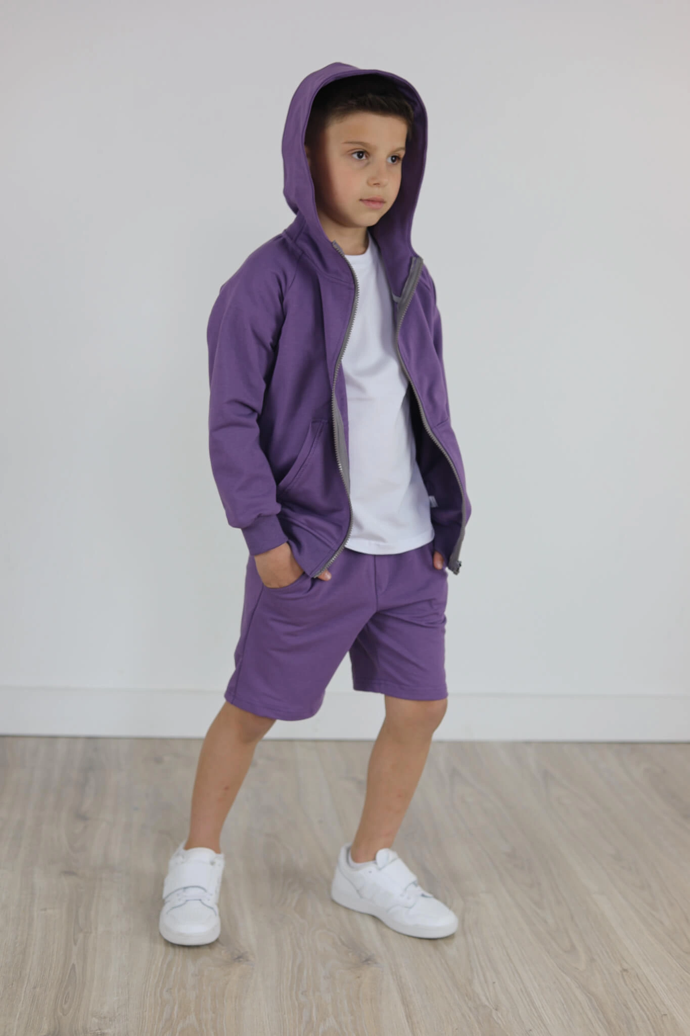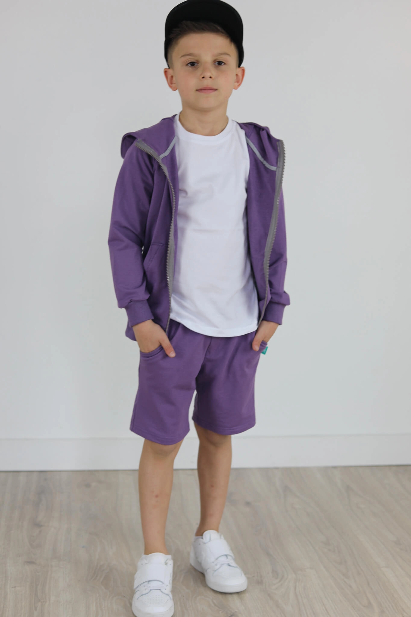 SPODENKI KLASYK z minimalistycznymi szwami z lekko obniżonym krokiem, nogawka trochę dłuższa aby spodenki nadawały się do szkoły i przedszkola wczesną wiosną.