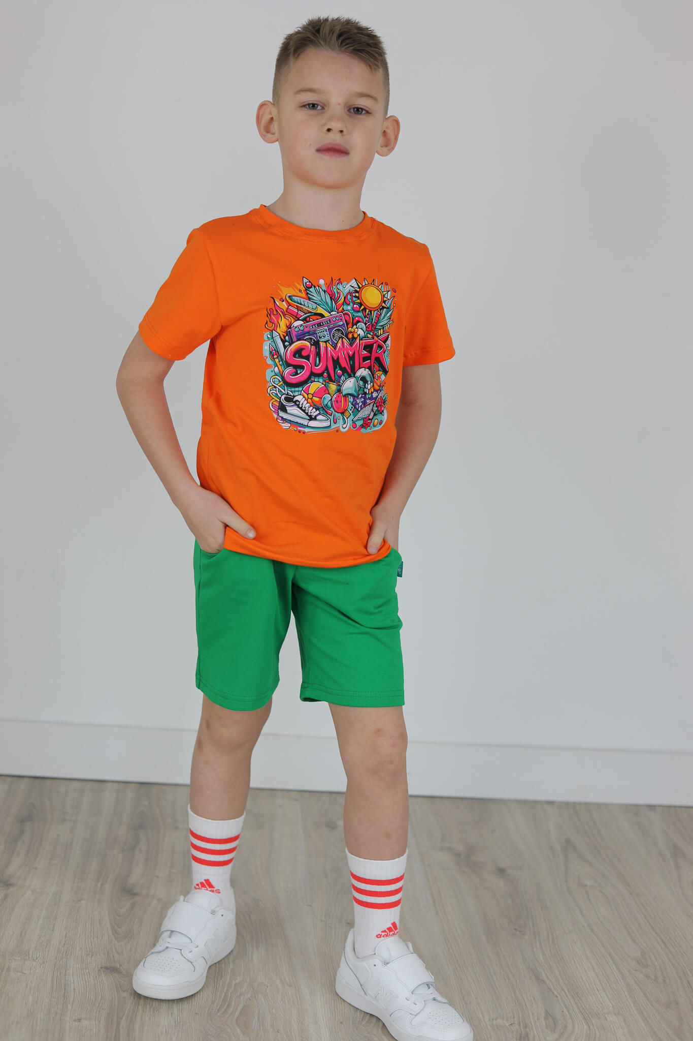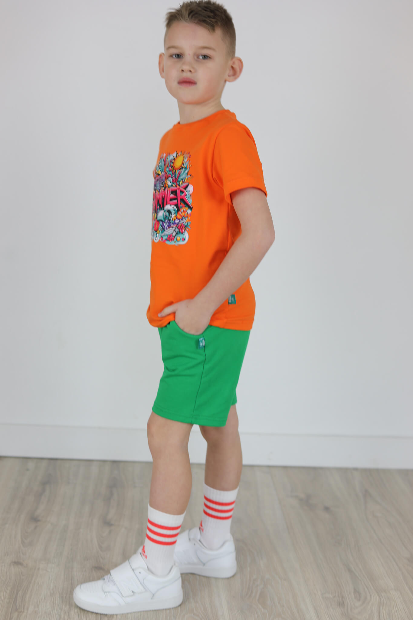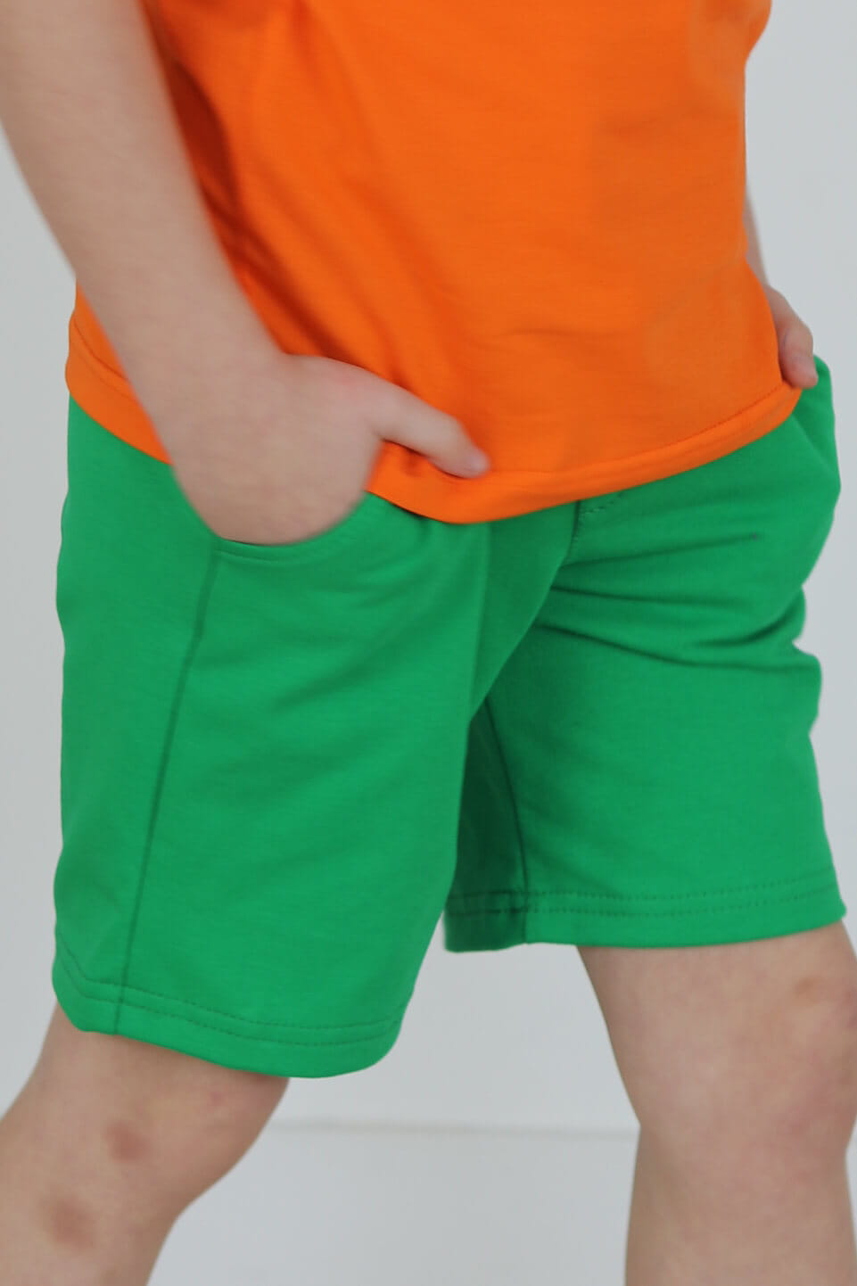 SPODENKI KLASYK z minimalistycznymi szwami z lekko obniżonym krokiem, nogawka trochę dłuższa aby spodenki nadawały się do szkoły i przedszkola wczesną wiosną.