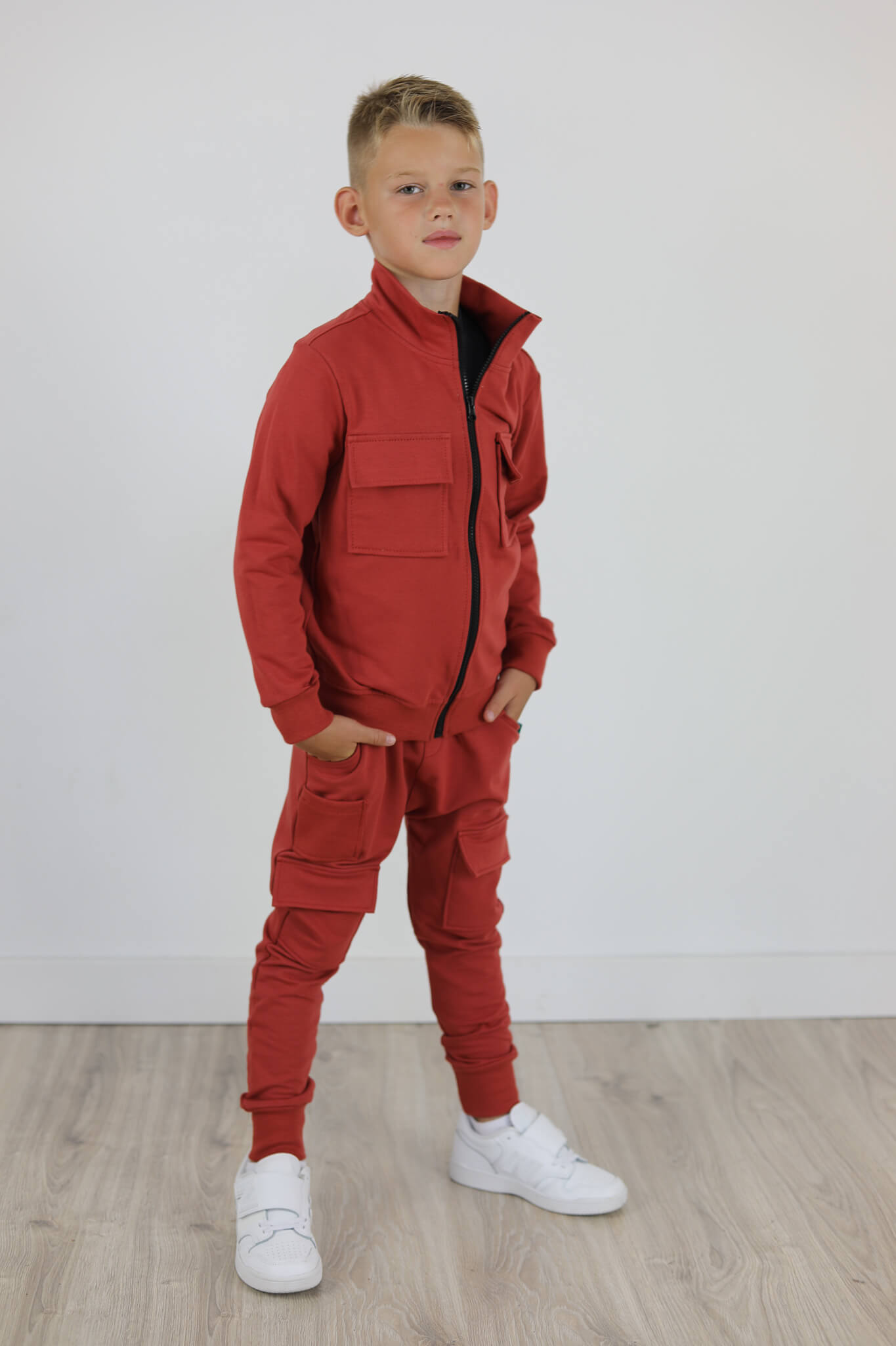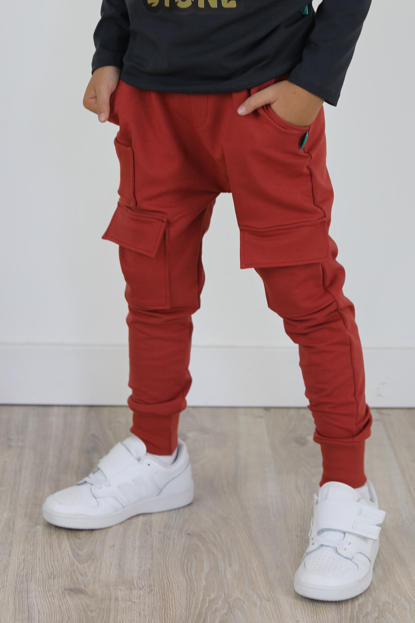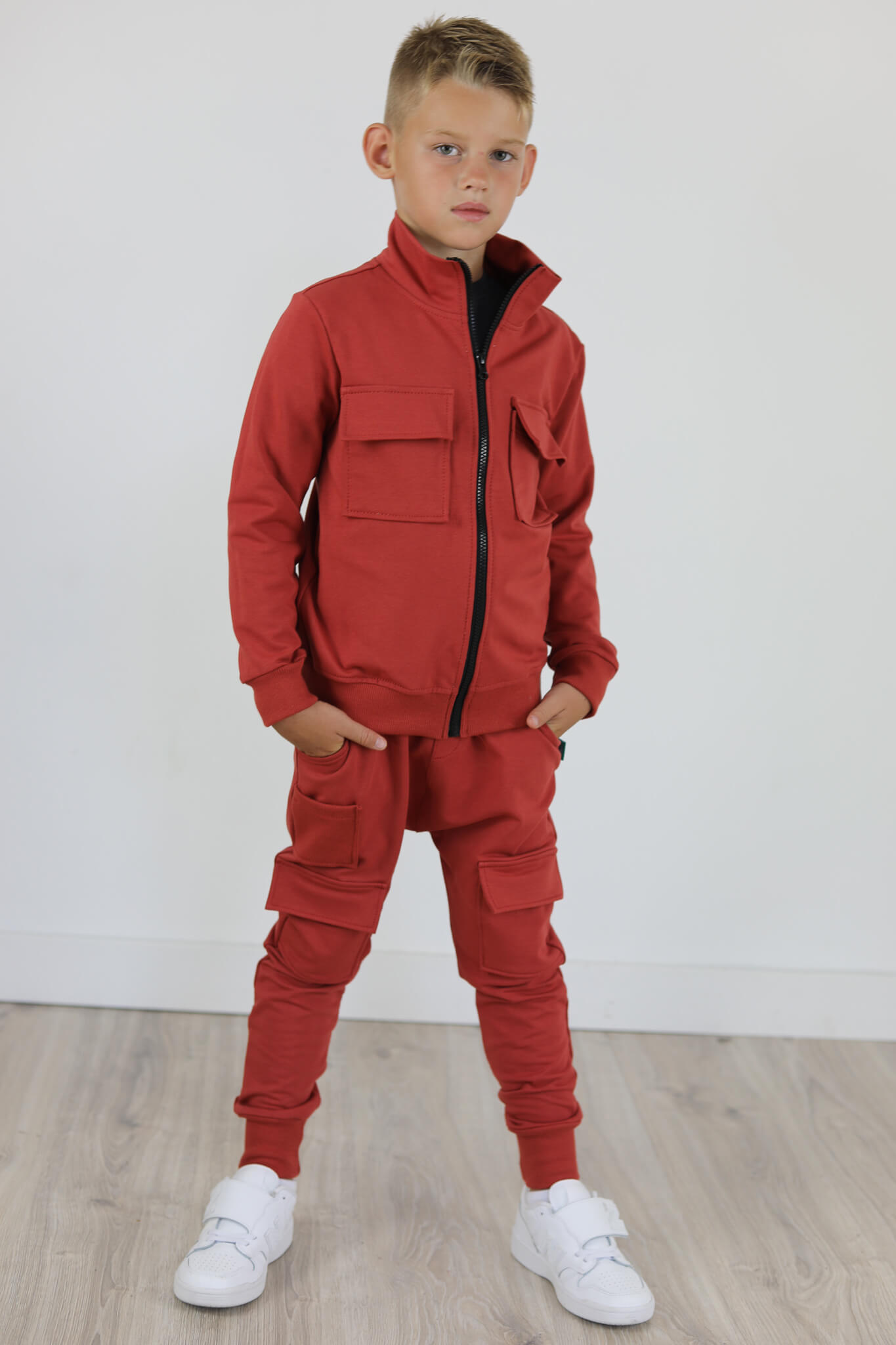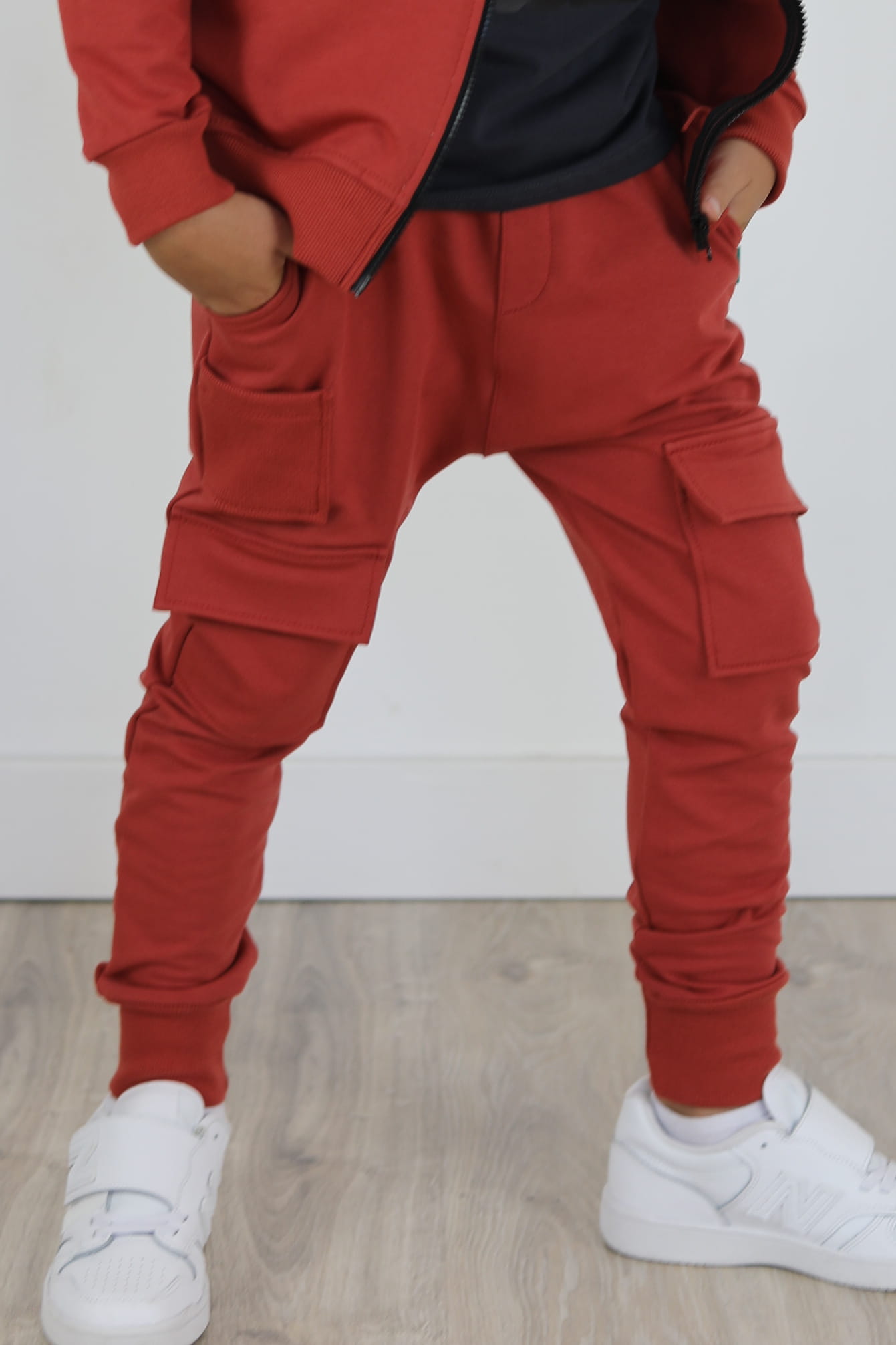 Zupełnie nowy model spodni. Wyglądają jak bojówki lecz kieszenie naszyte są na przodzie spodni. Mankiety spodni i mała kieszonka naszyta na przodzie są ze ściągacza w kolorze dresu. Spodnie z lekko obniżonym krokiem.