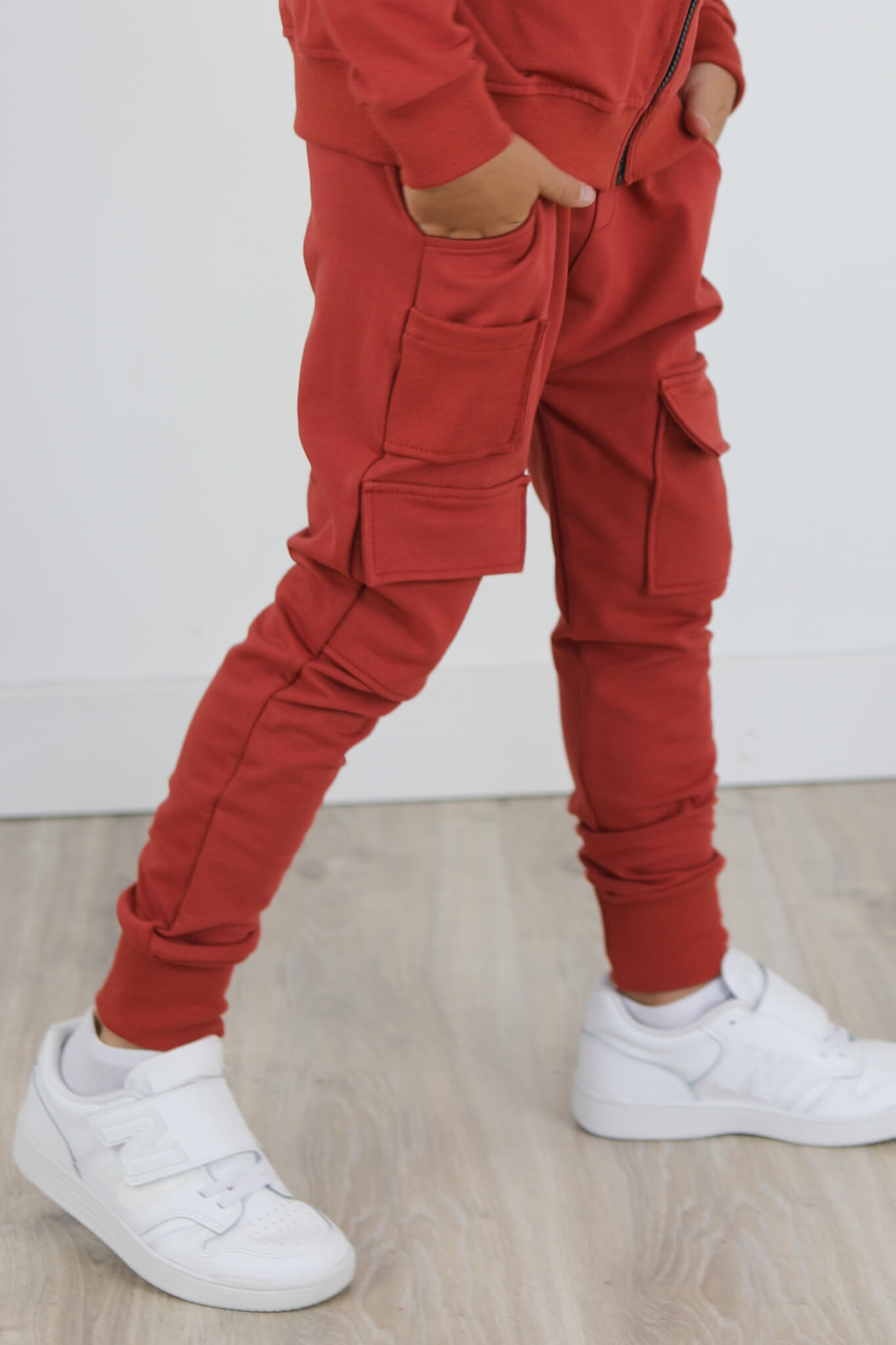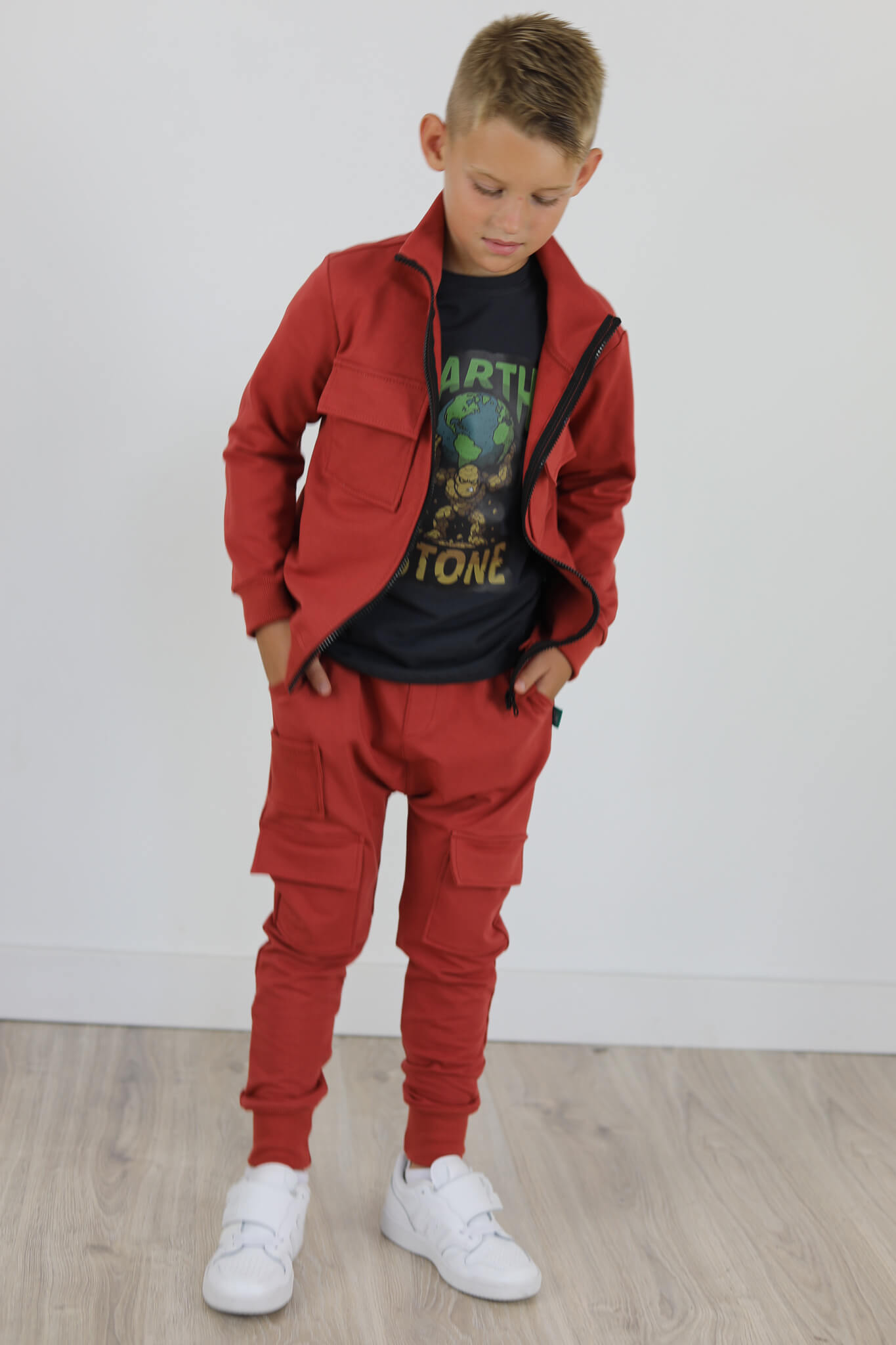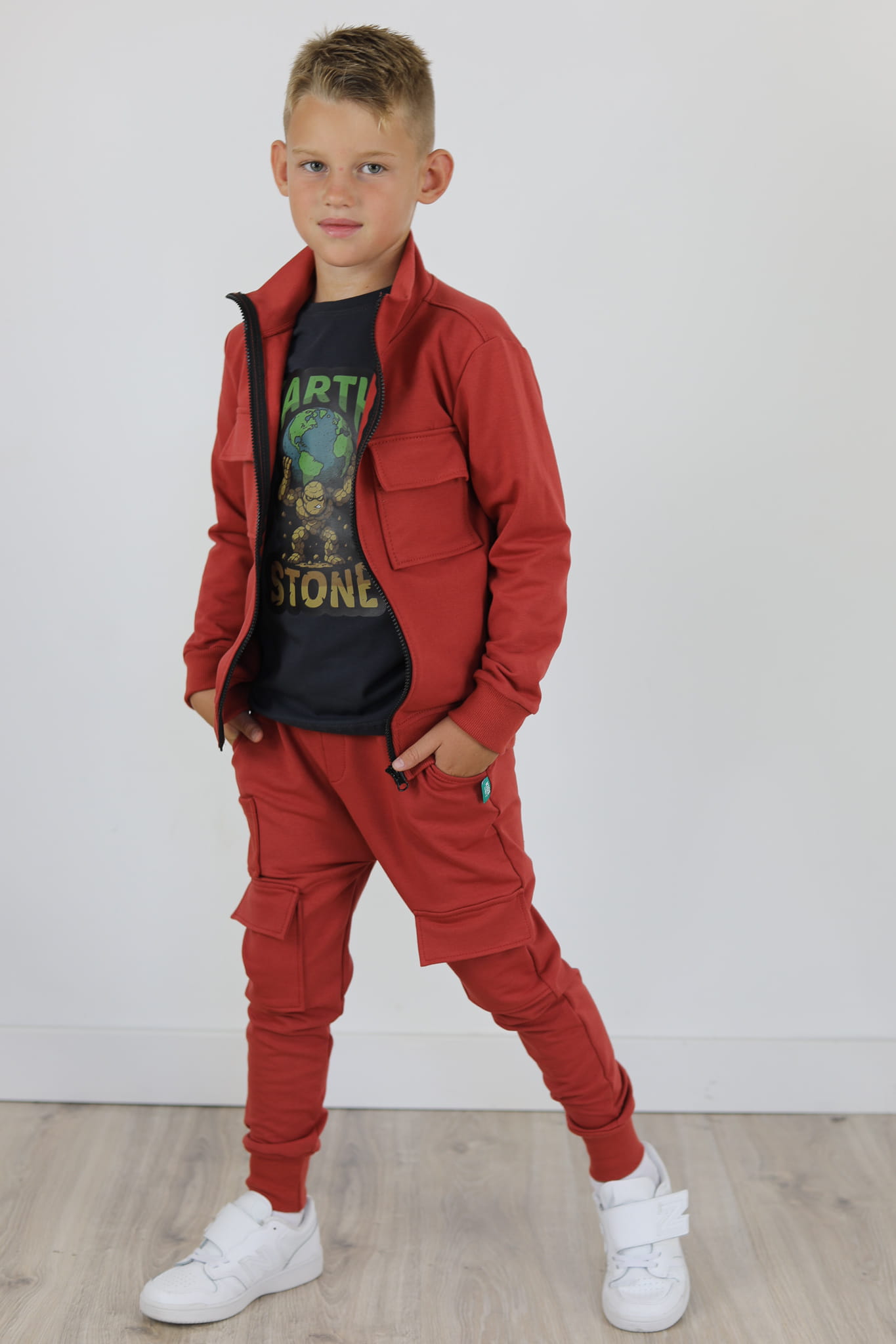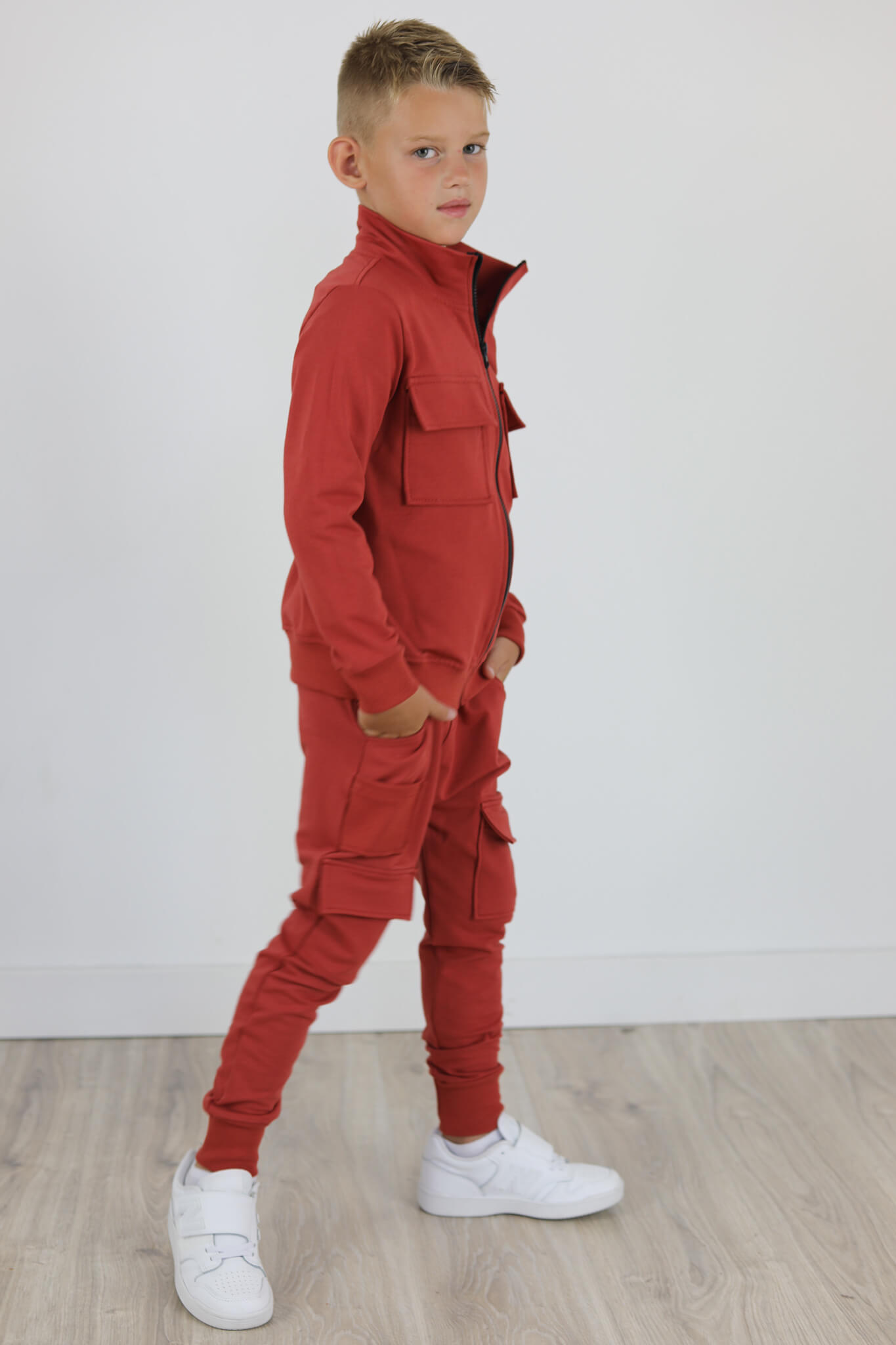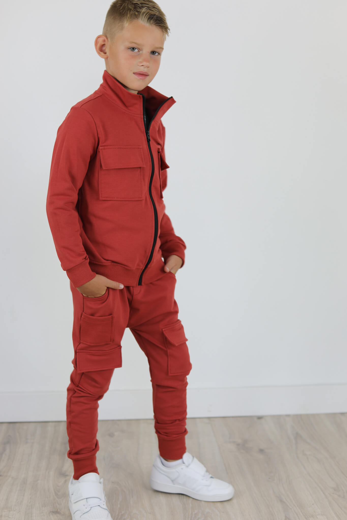 Zupełnie nowy model spodni. Wyglądają jak bojówki lecz kieszenie naszyte są na przodzie spodni. Mankiety spodni i mała kieszonka naszyta na przodzie są ze ściągacza w kolorze dresu. Spodnie z lekko obniżonym krokiem.