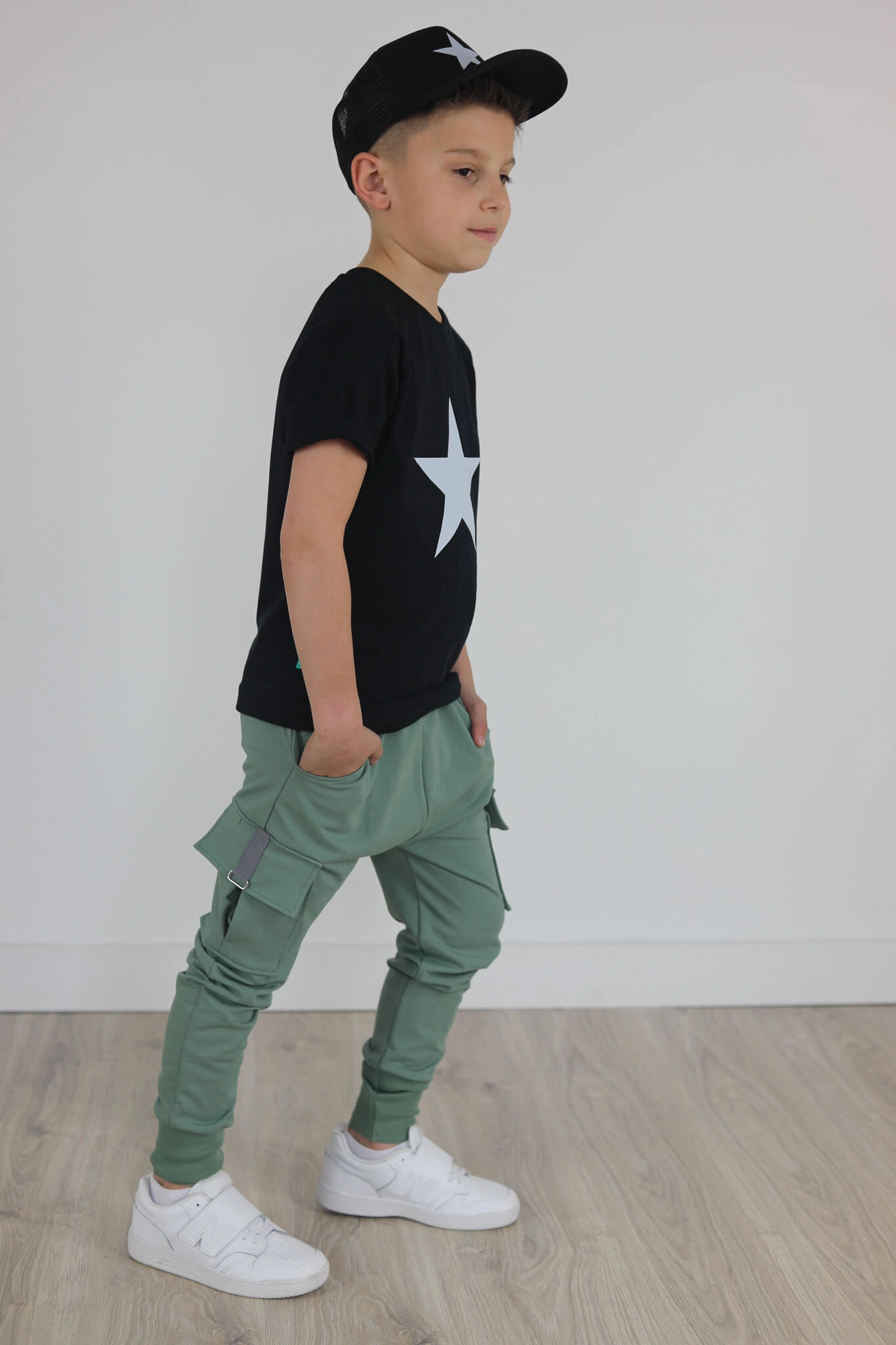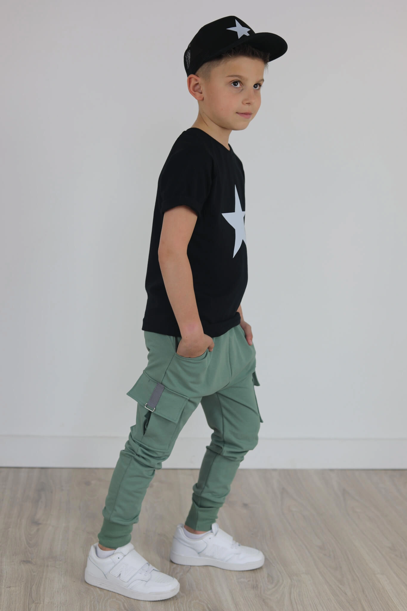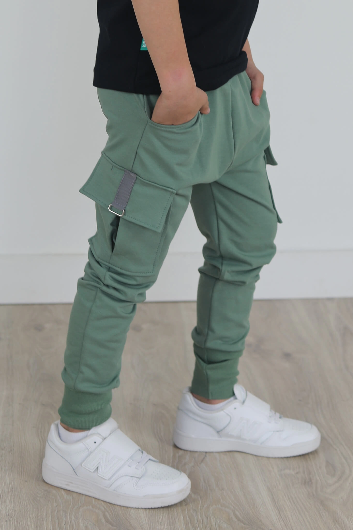 Spodnie bojówki z obniżonym krokiem i wysokim mankietem (mankiet wykończony na surowo) z oczkiem i taśmą.