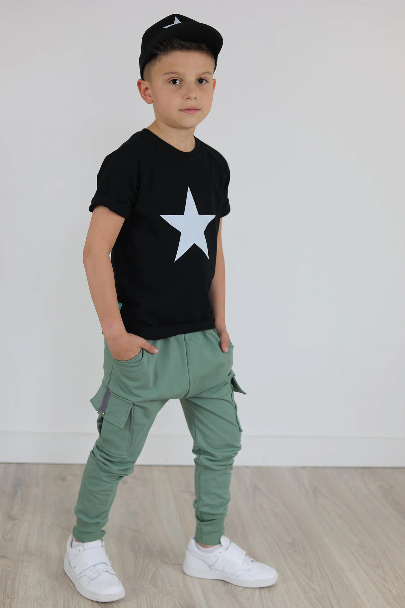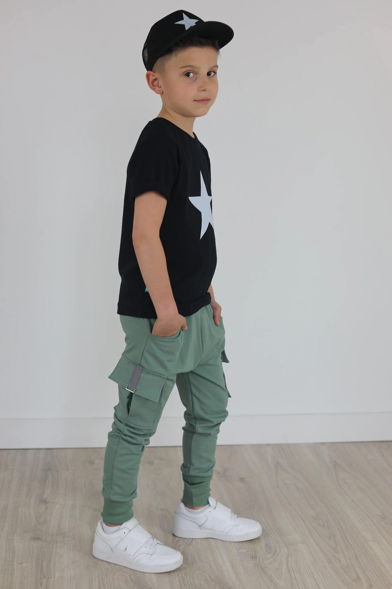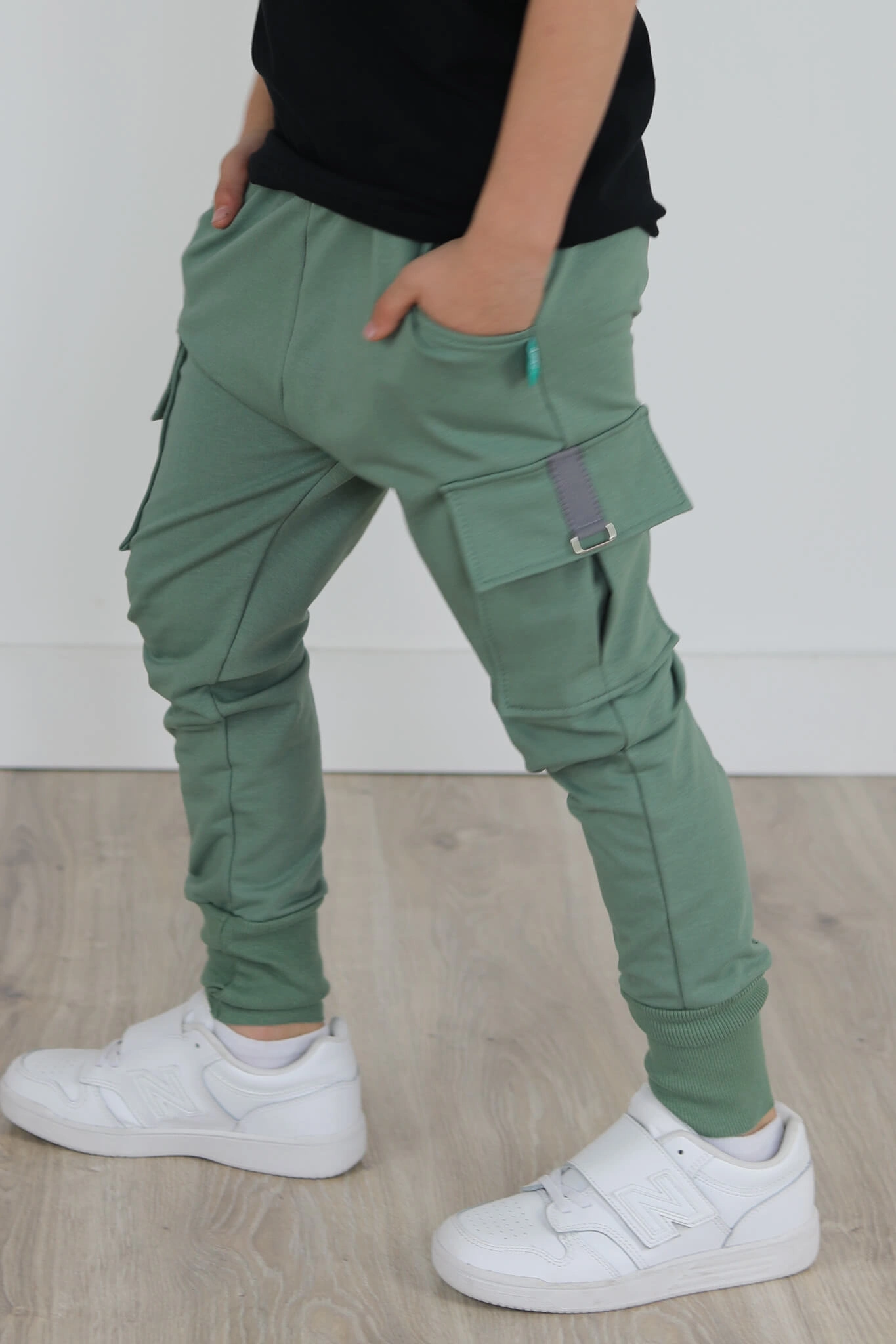 Spodnie bojówki z obniżonym krokiem i wysokim mankietem (mankiet wykończony na surowo) z oczkiem i taśmą.