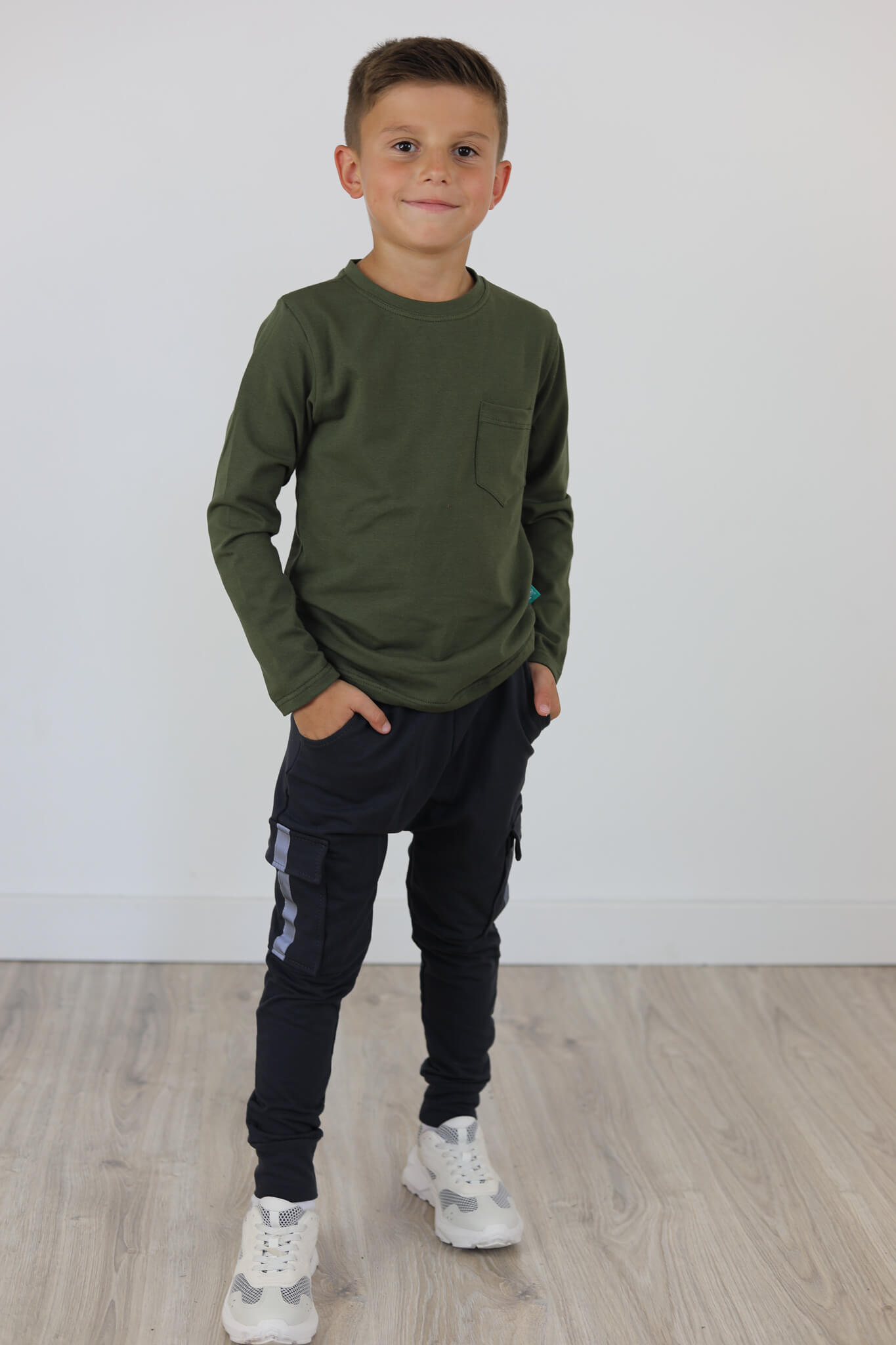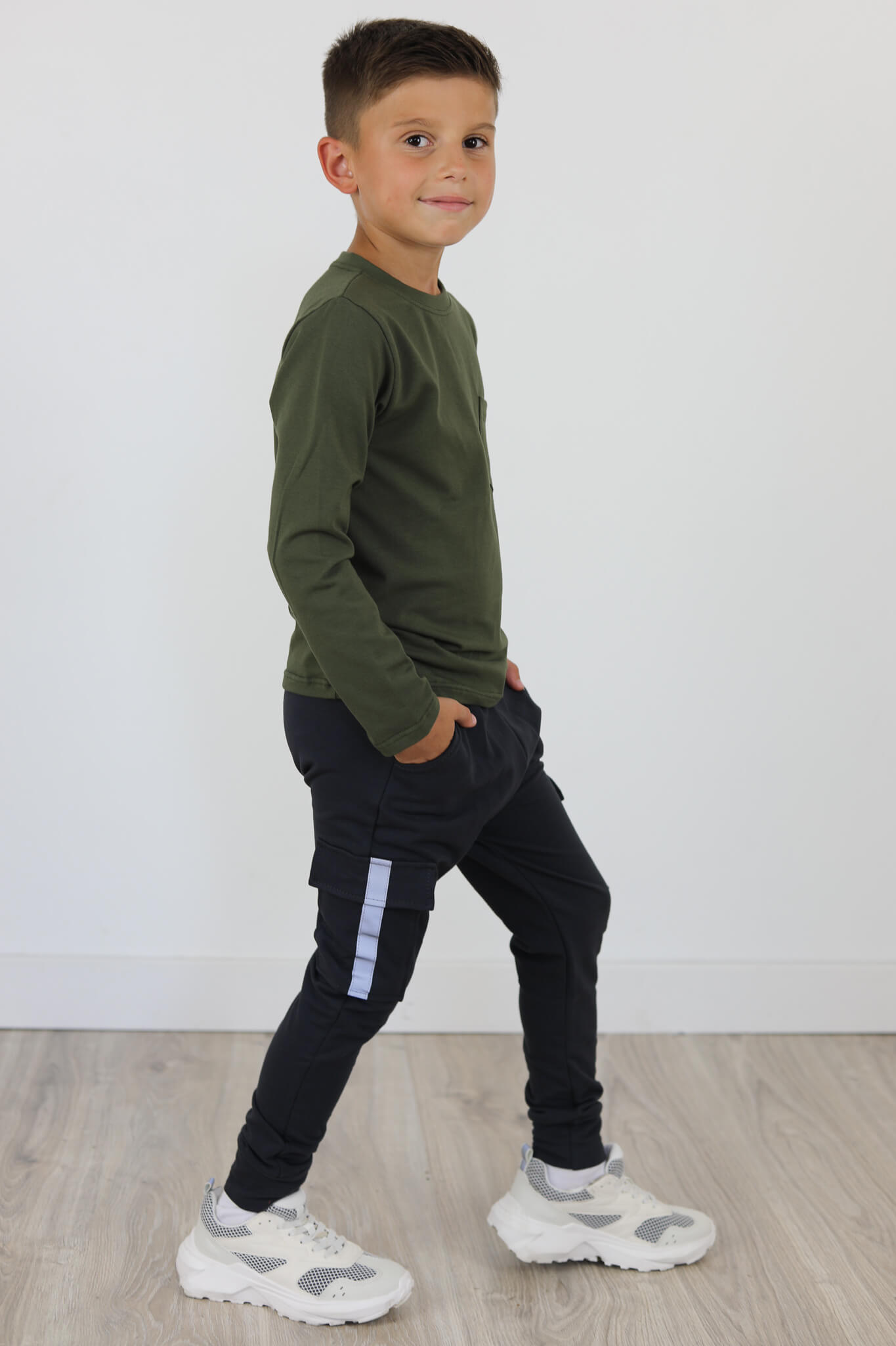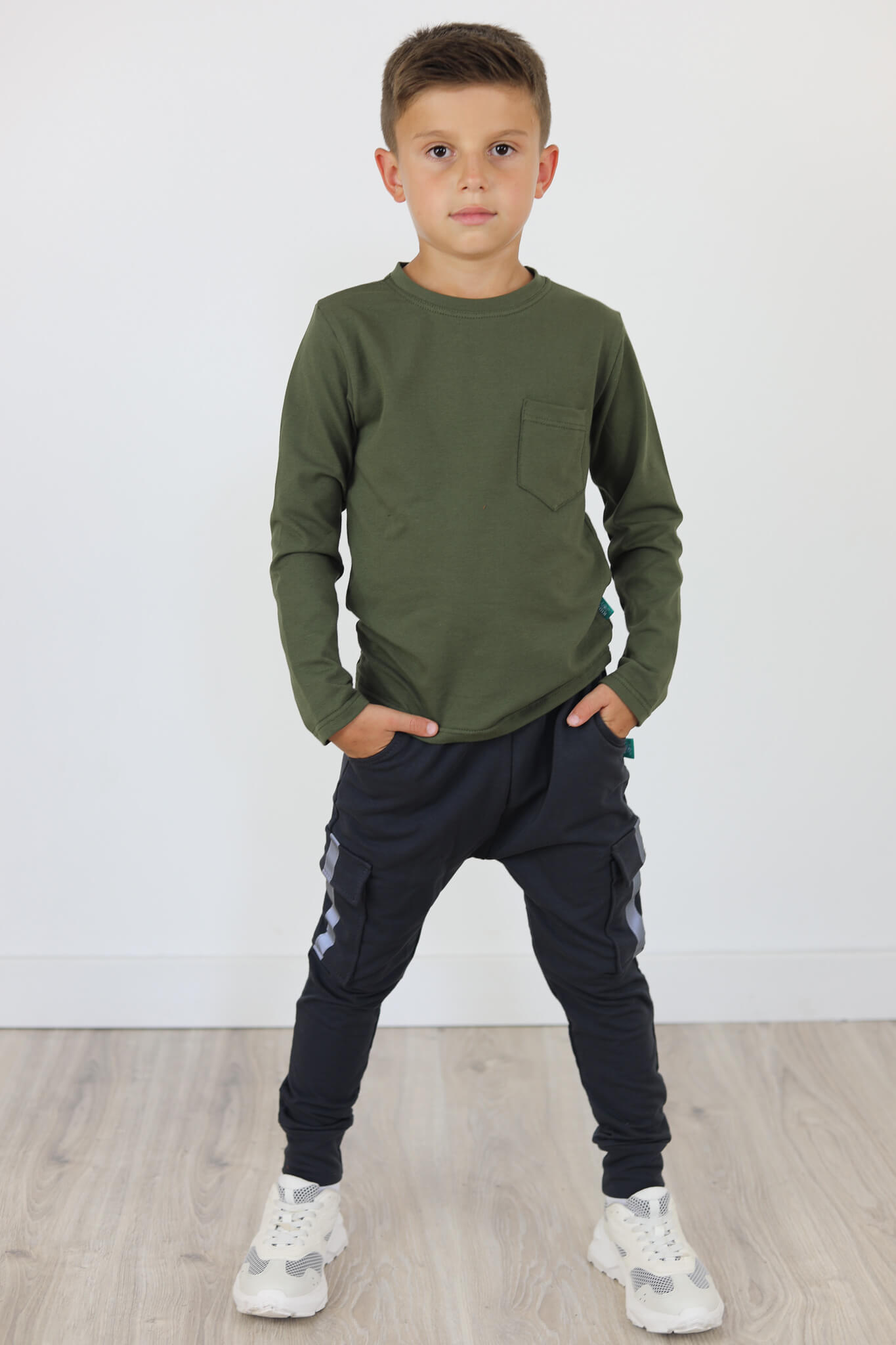 Spodnie BOJÓWKI z TAŚMĄ ODBLASKOWĄ na kieszonce u patce to propozycja zarówno modowa jak i praktyczna. W sezonie jesienno-zimowy szybko robi się ciemno dlatego zrobiliśmy spodnie w których dziecko będzie mocno widoczne po zmroku.