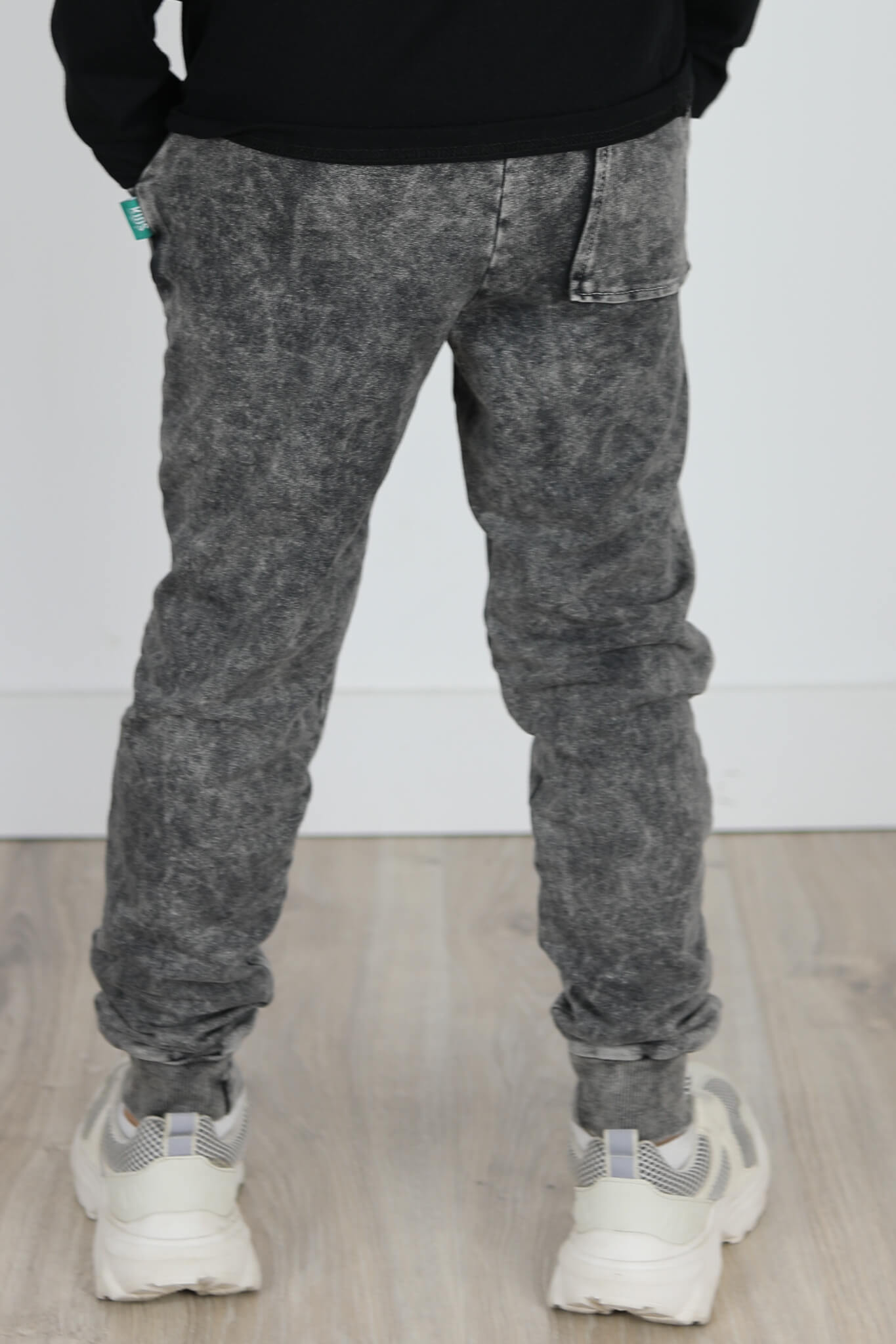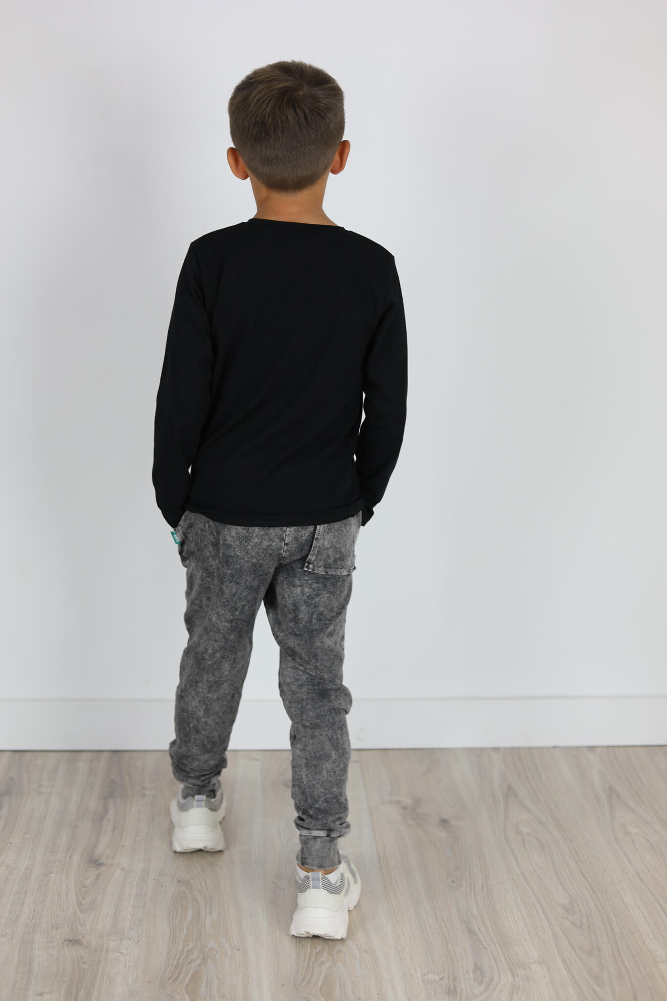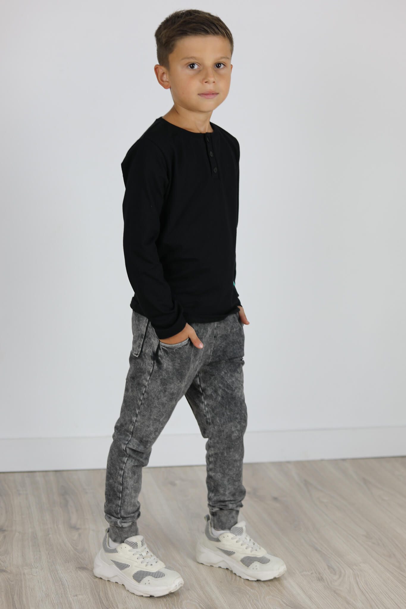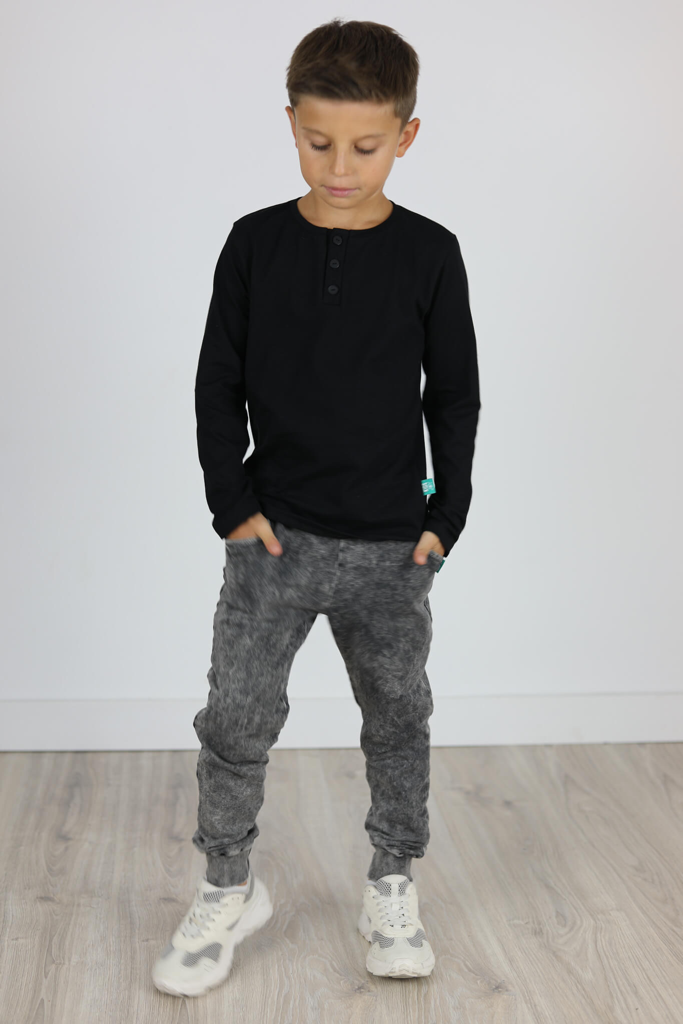 Model spodni z obniżonym krokiem i lekko zwężona nogawką ku dołowi. Nogawki zakończone podwójnym ściągaczem. Z tyłu kieszonka.