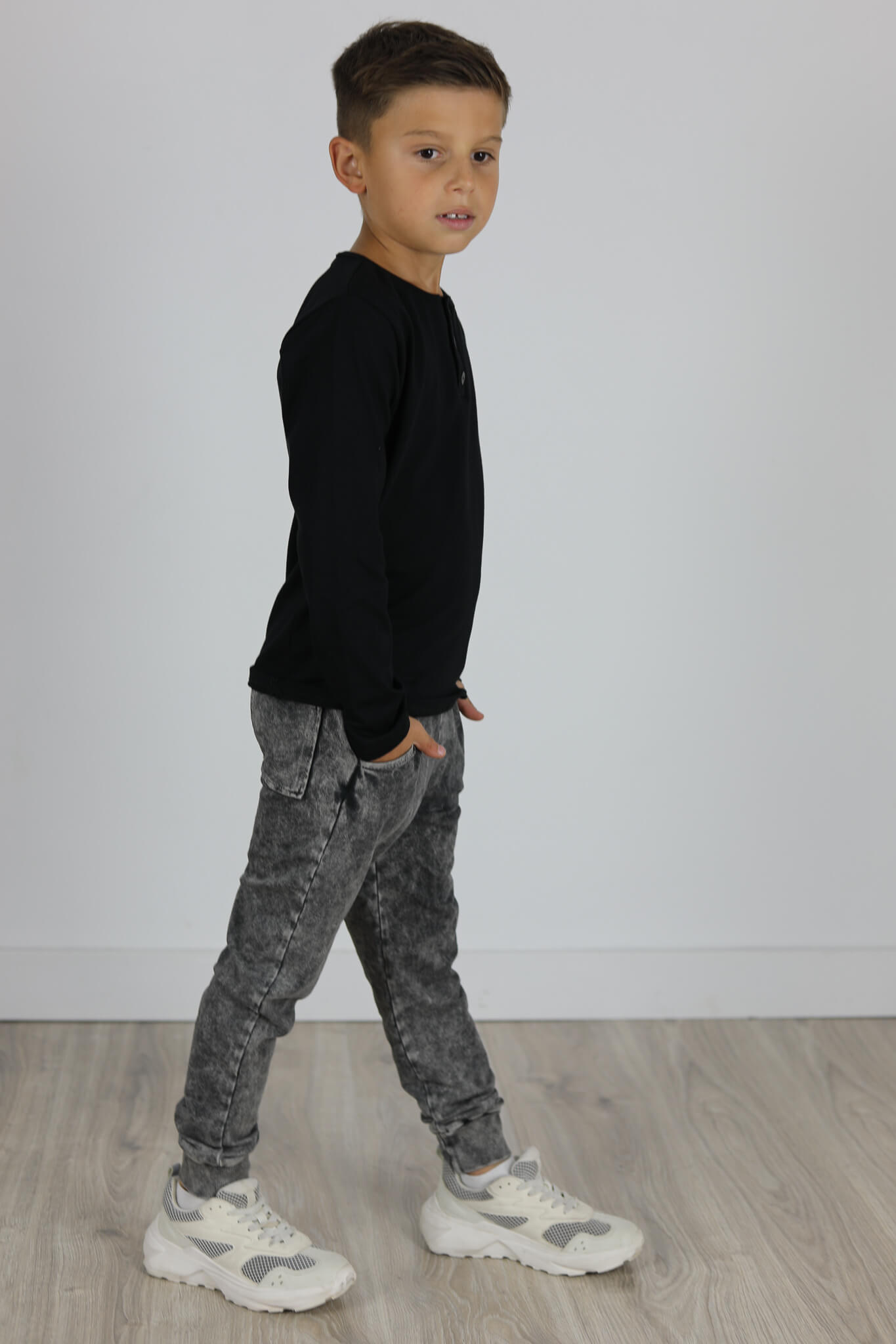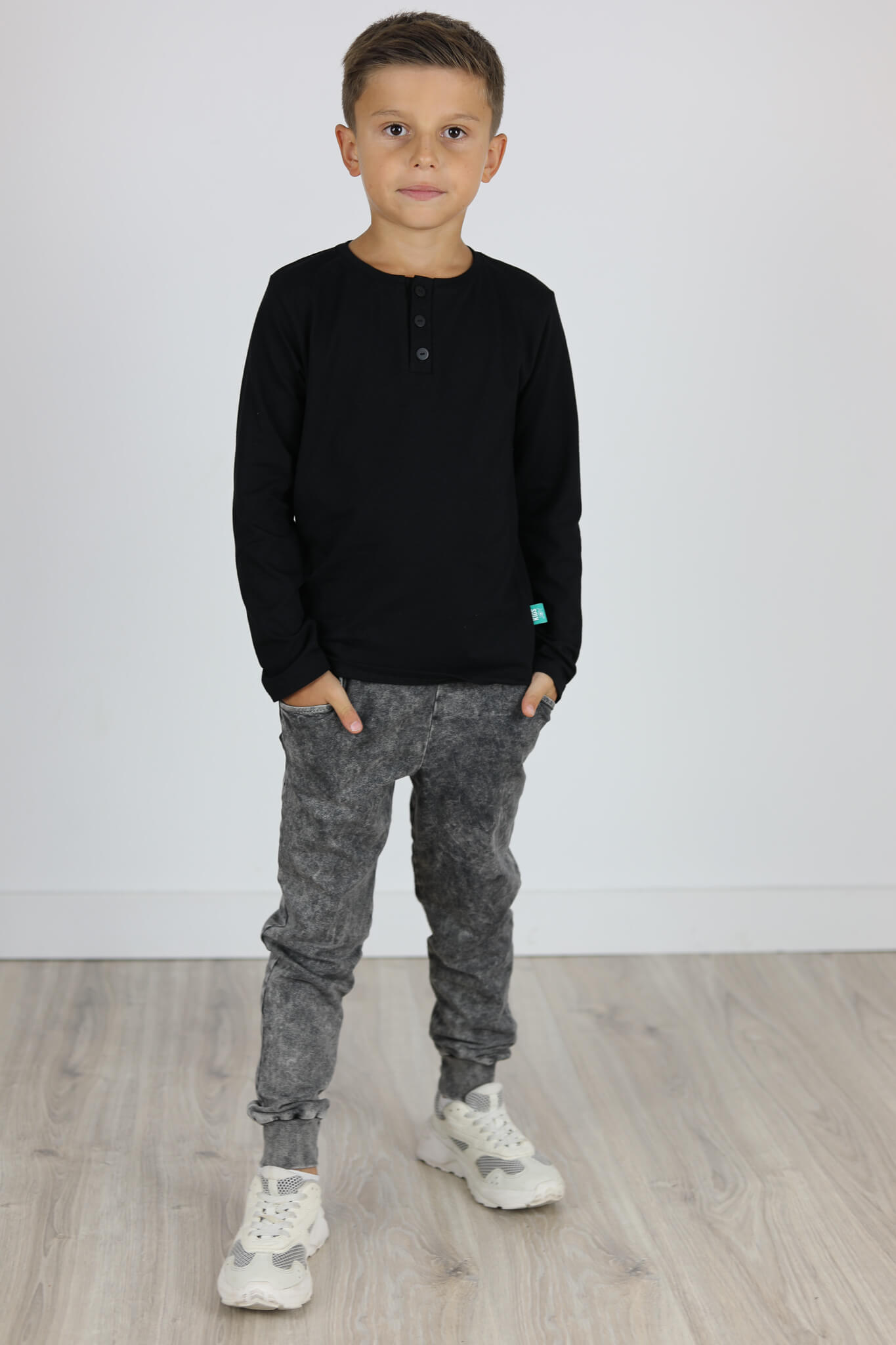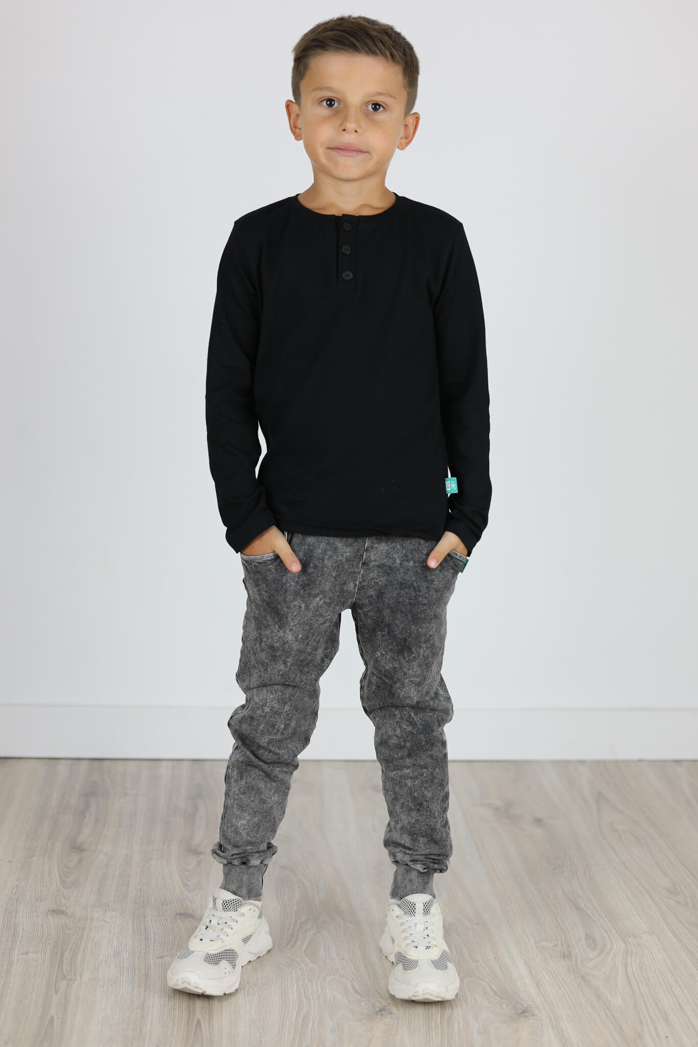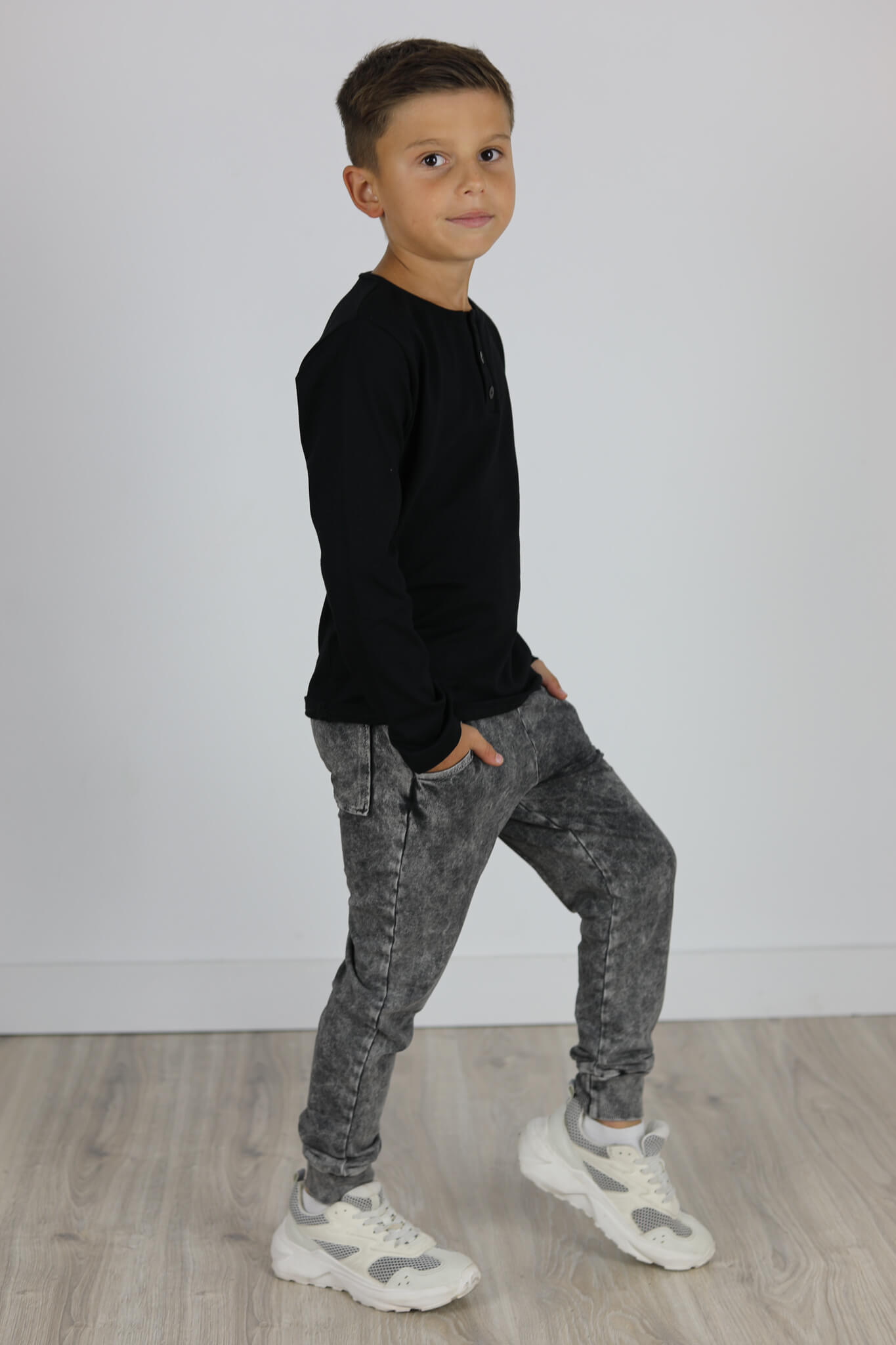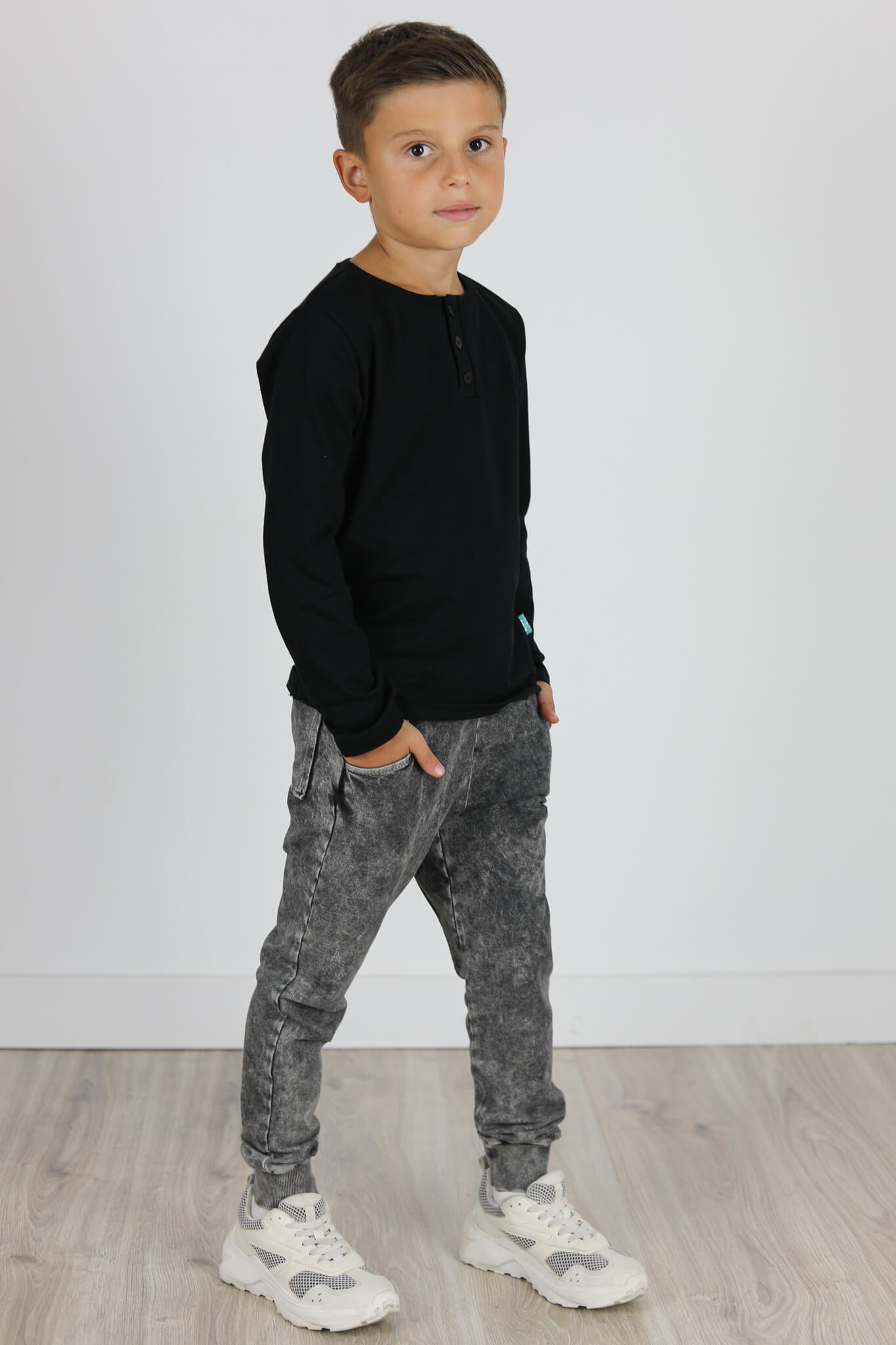 Model spodni z obniżonym krokiem i lekko zwężona nogawką ku dołowi. Nogawki zakończone podwójnym ściągaczem. Z tyłu kieszonka.