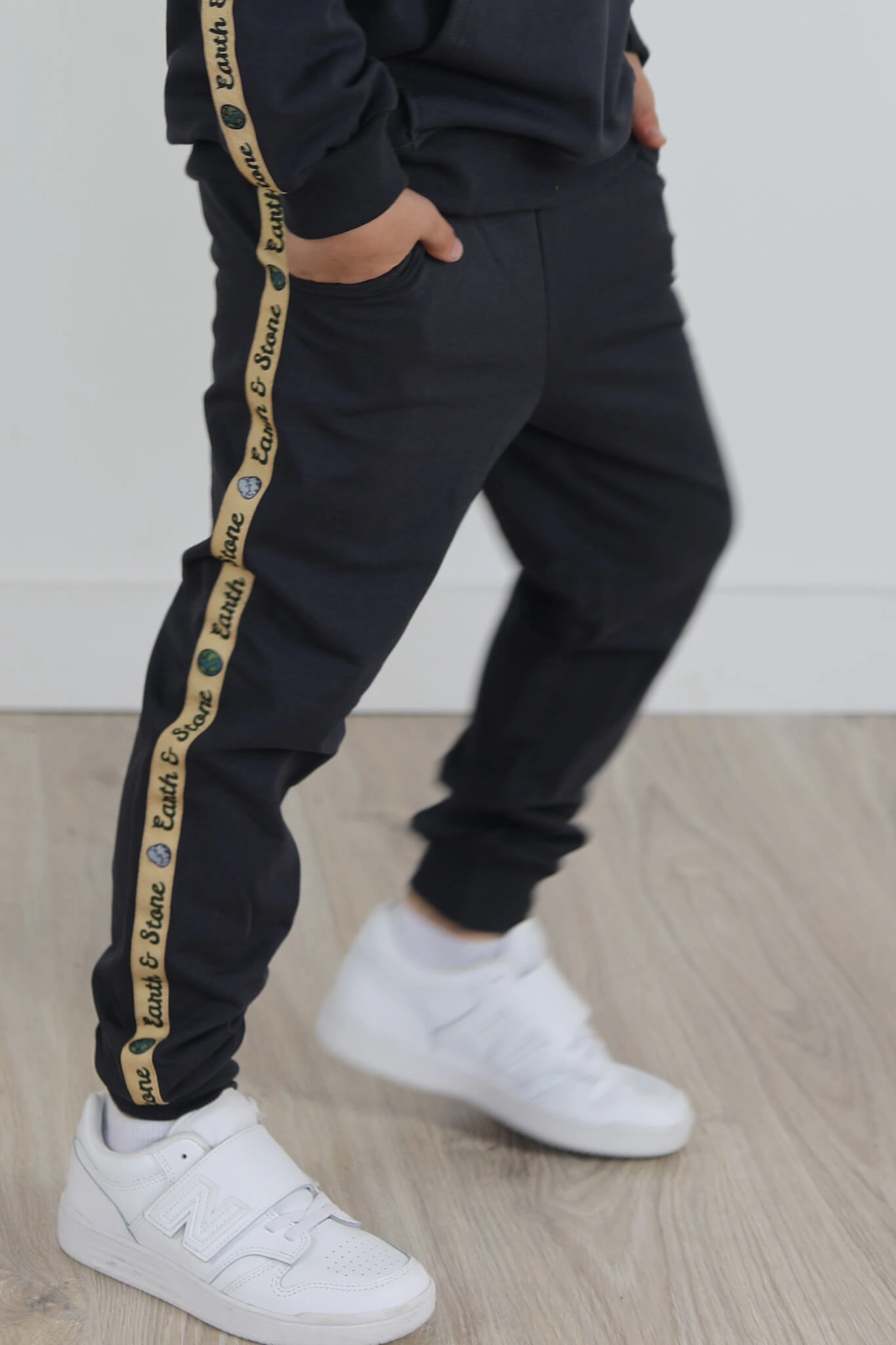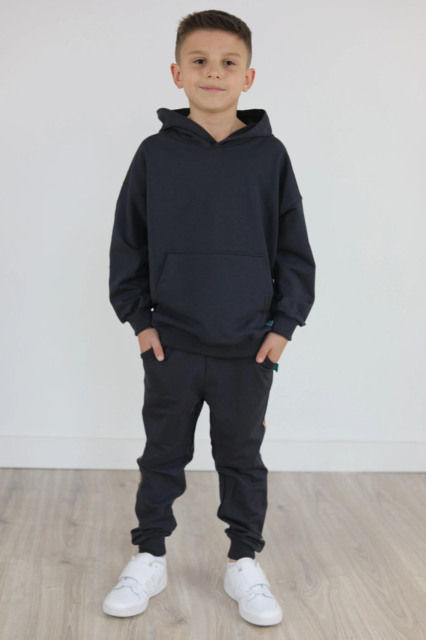 Spodnie w pasie posiadają gumkę. Mankiety i pas ze ściągacza w kolorze dresu.