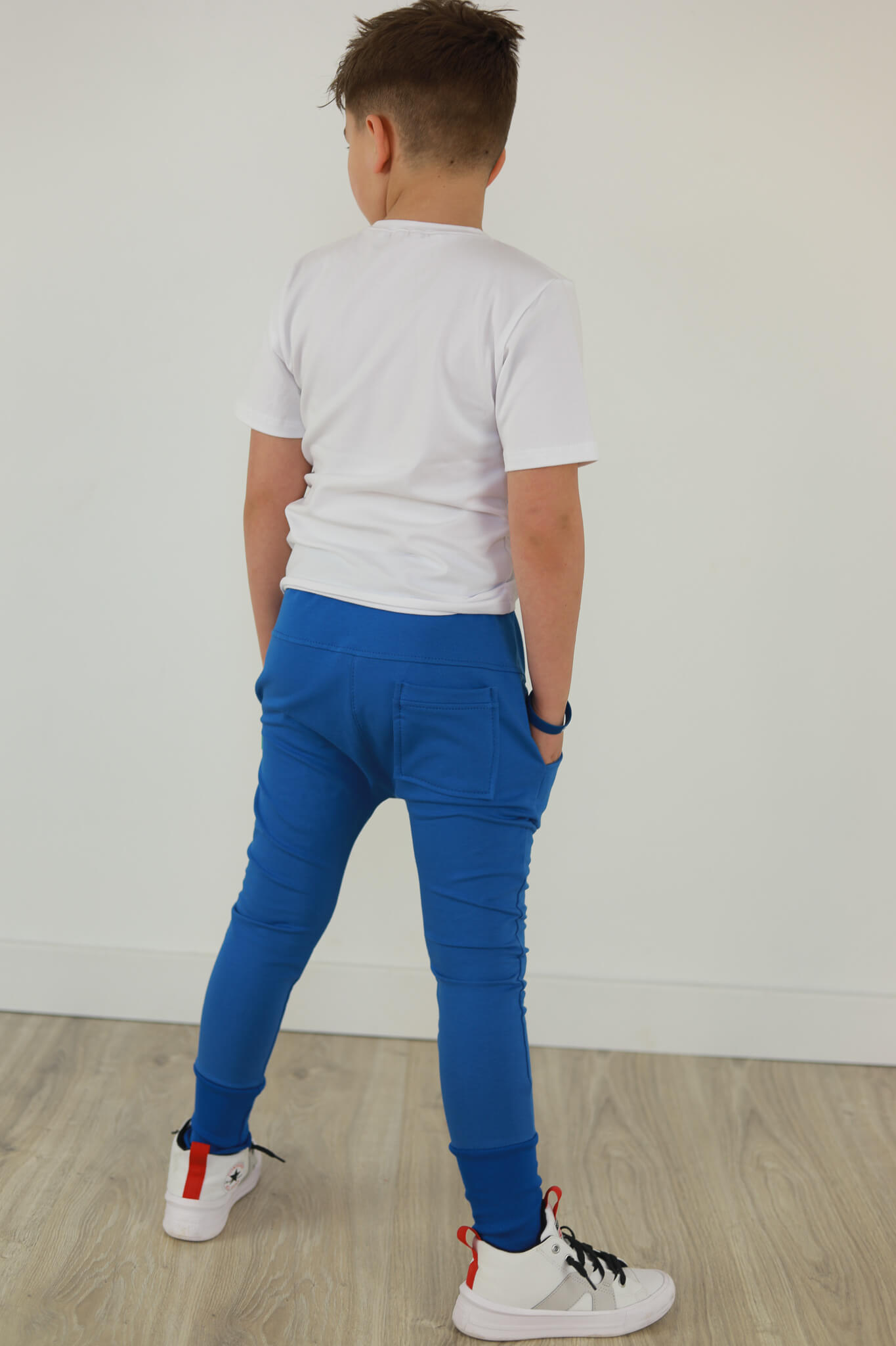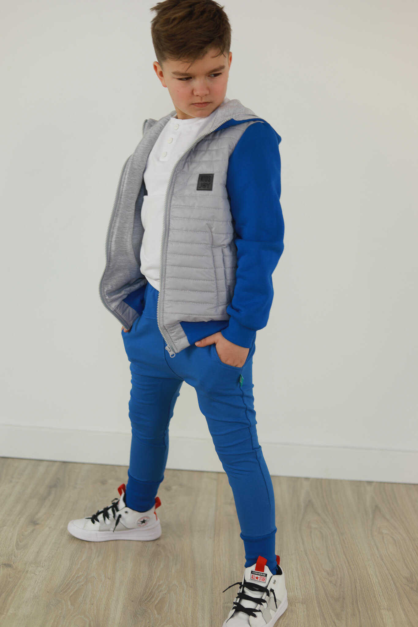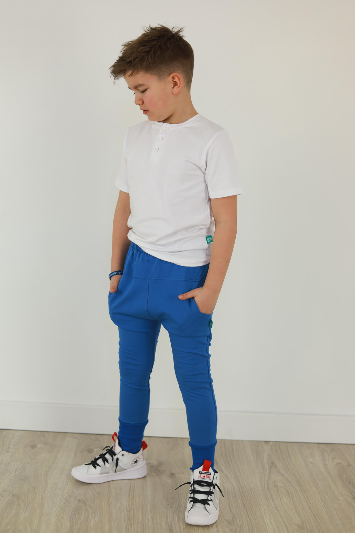 Genialne spodnie z karczkiem ozdobnym z tyłu i z przodu. Spodnie mają szerokie pojedyńcze ściągacze u dołu (ściągacz w ciemniejszym odcieniu chabru), zakończone na surowo dla komfortu dziecka.