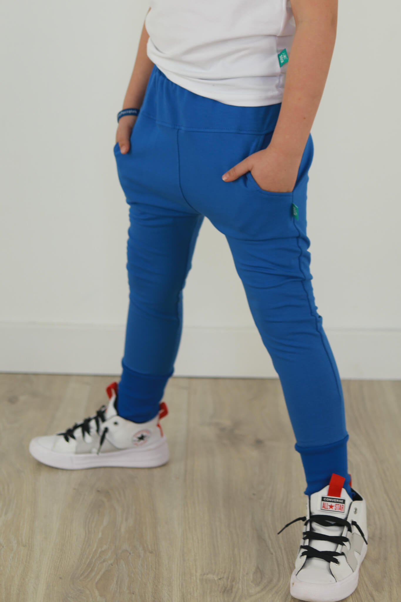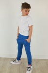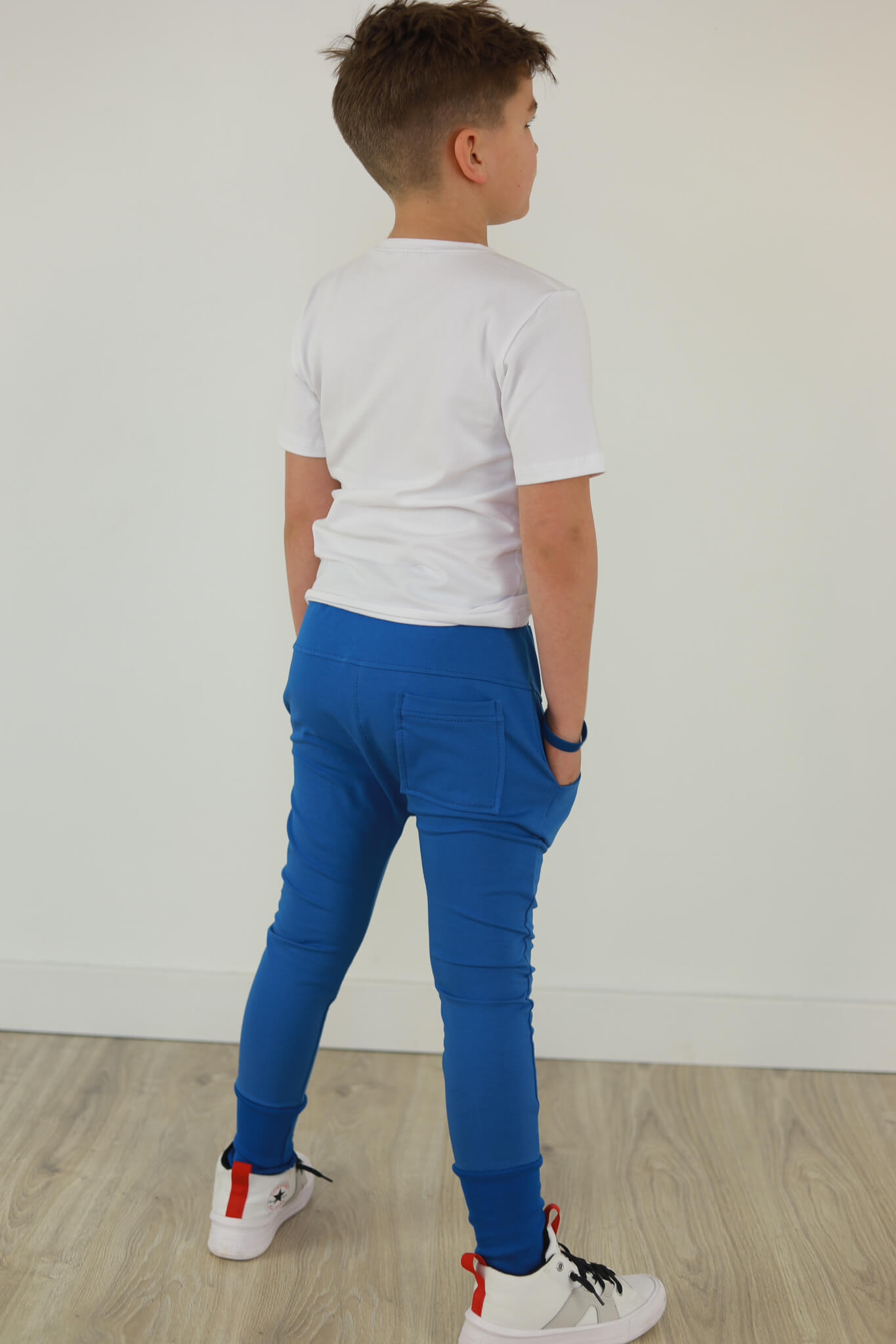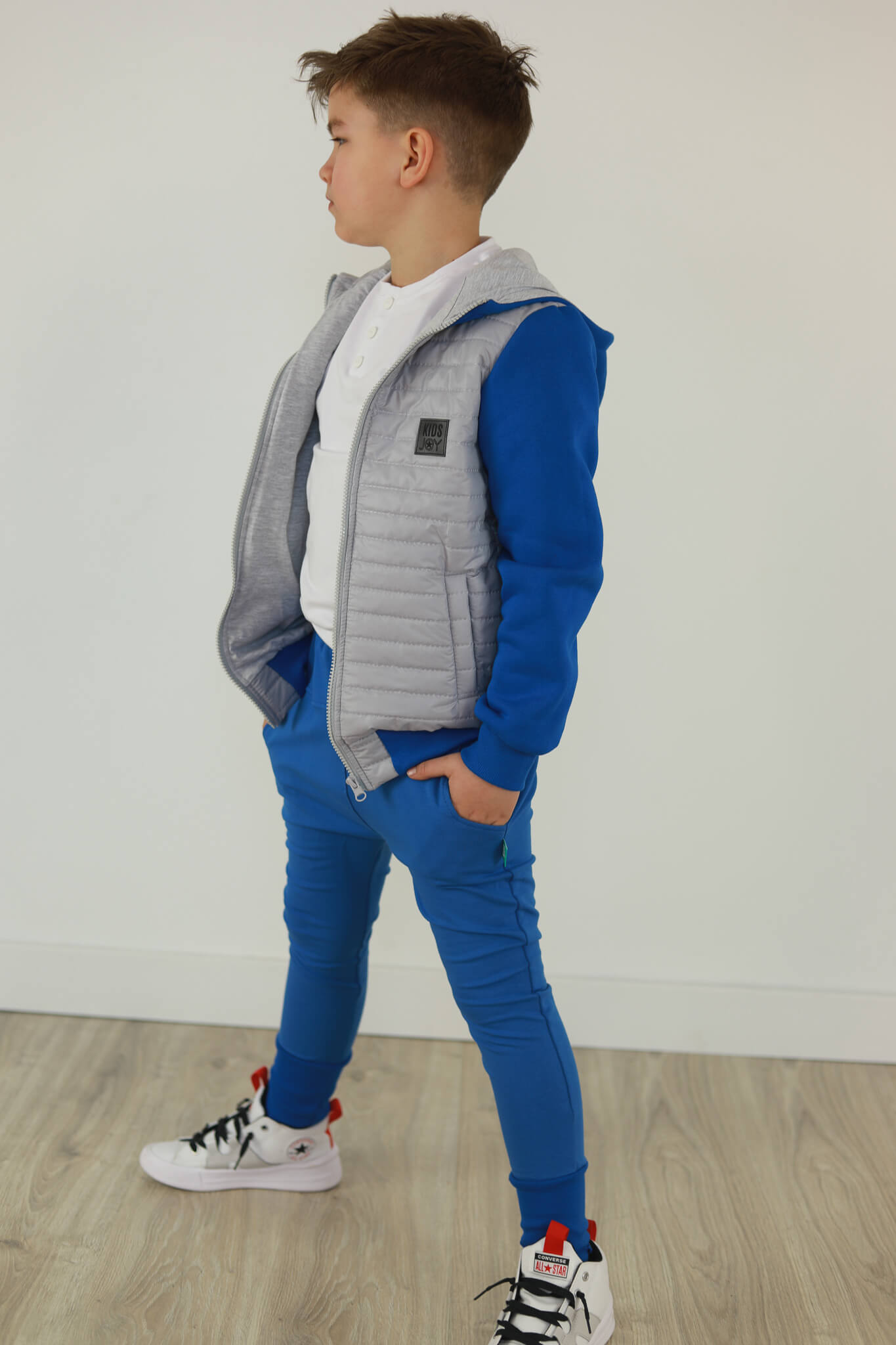 Genialne spodnie z karczkiem ozdobnym z tyłu i z przodu. Spodnie mają szerokie pojedyńcze ściągacze u dołu (ściągacz w ciemniejszym odcieniu chabru), zakończone na surowo dla komfortu dziecka.
