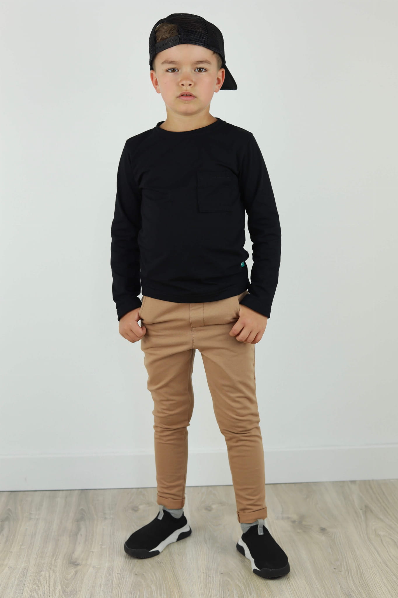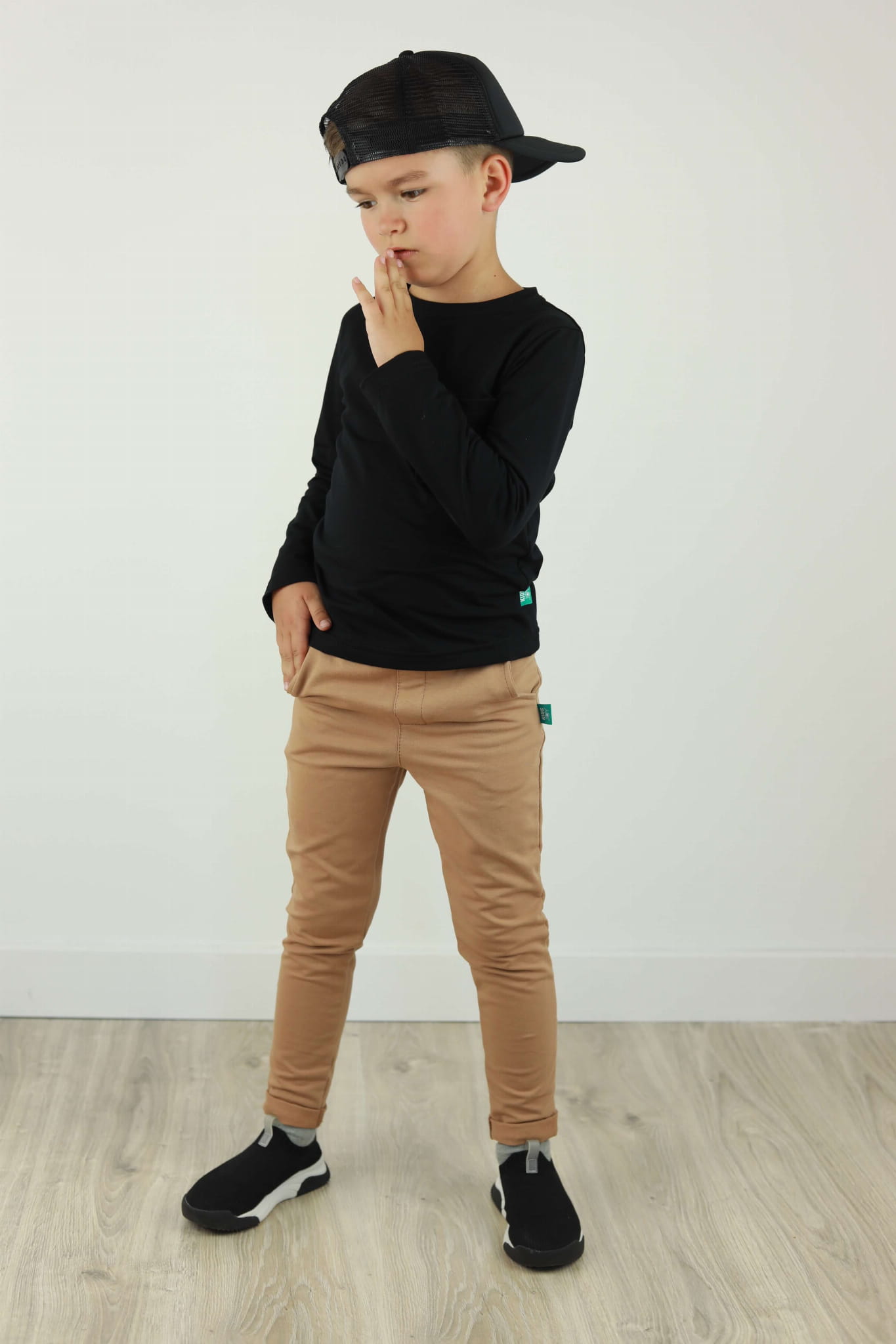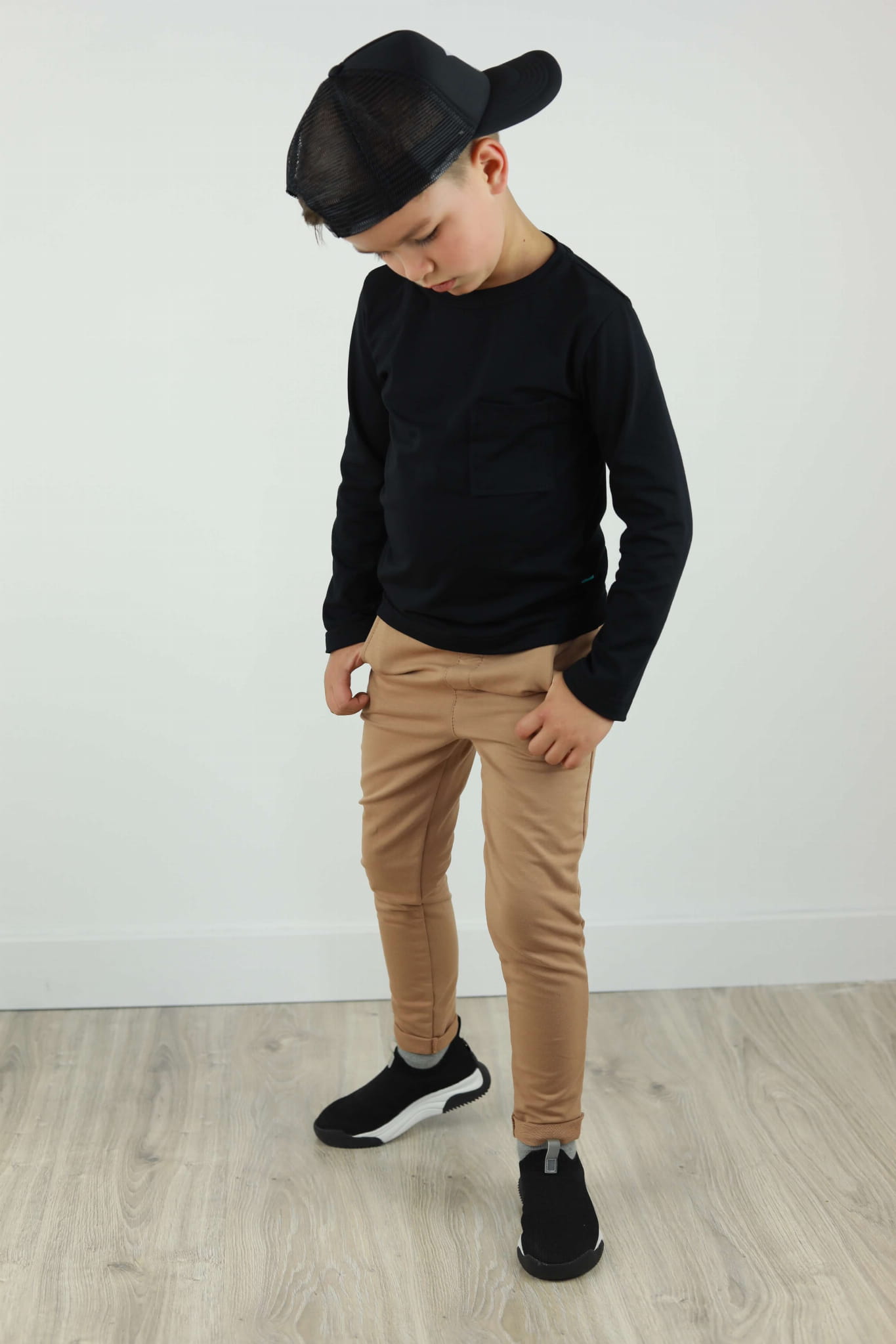Spodnie RURKI z karczkiem i kieszonką z tyłu, wykończone zabezpieczonym wywinięciem.