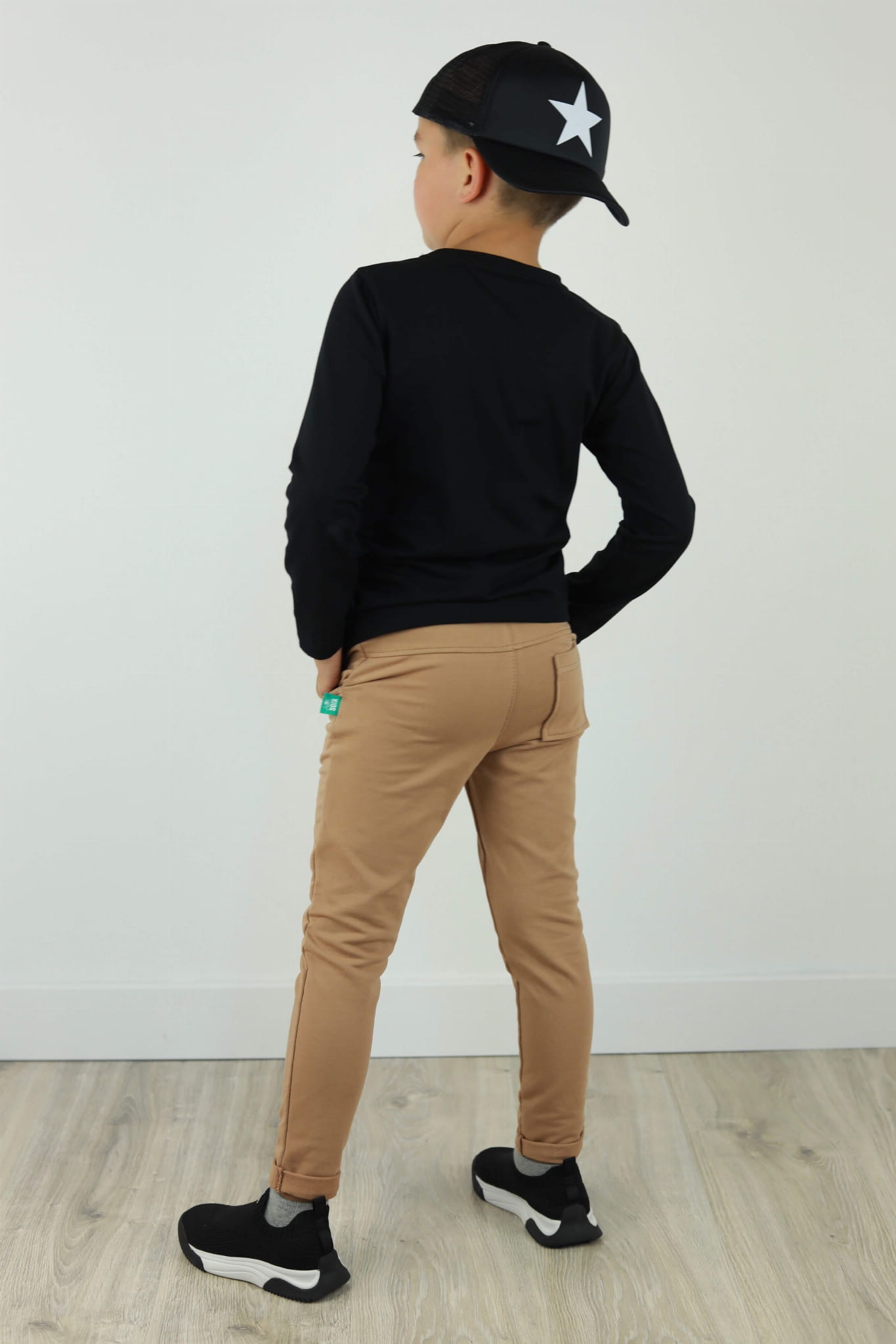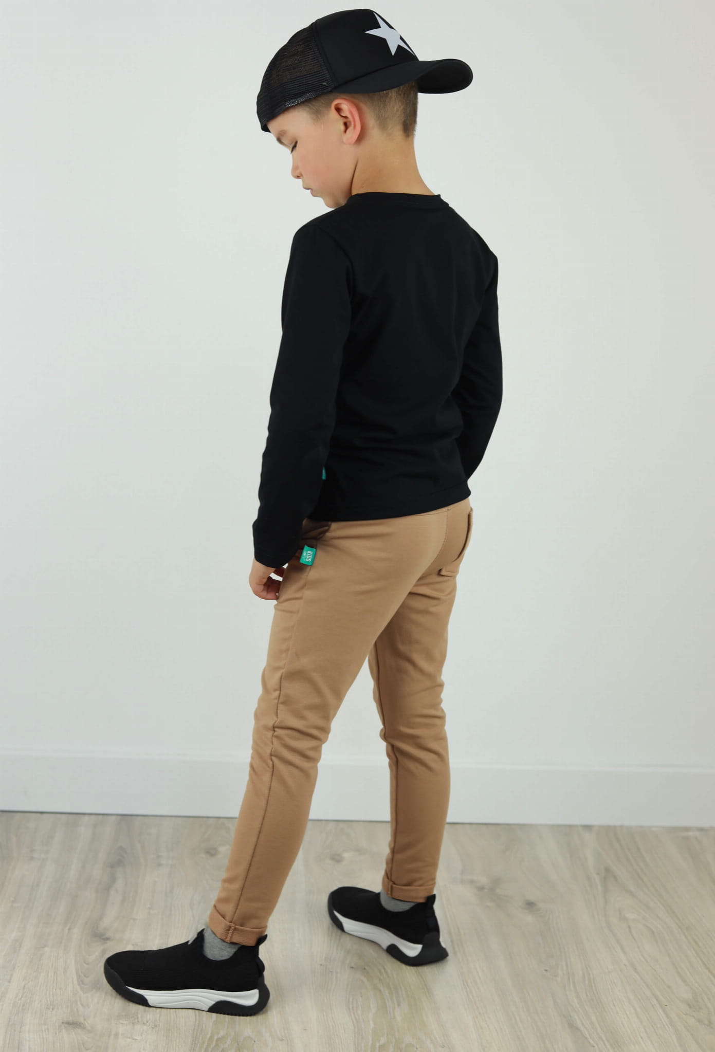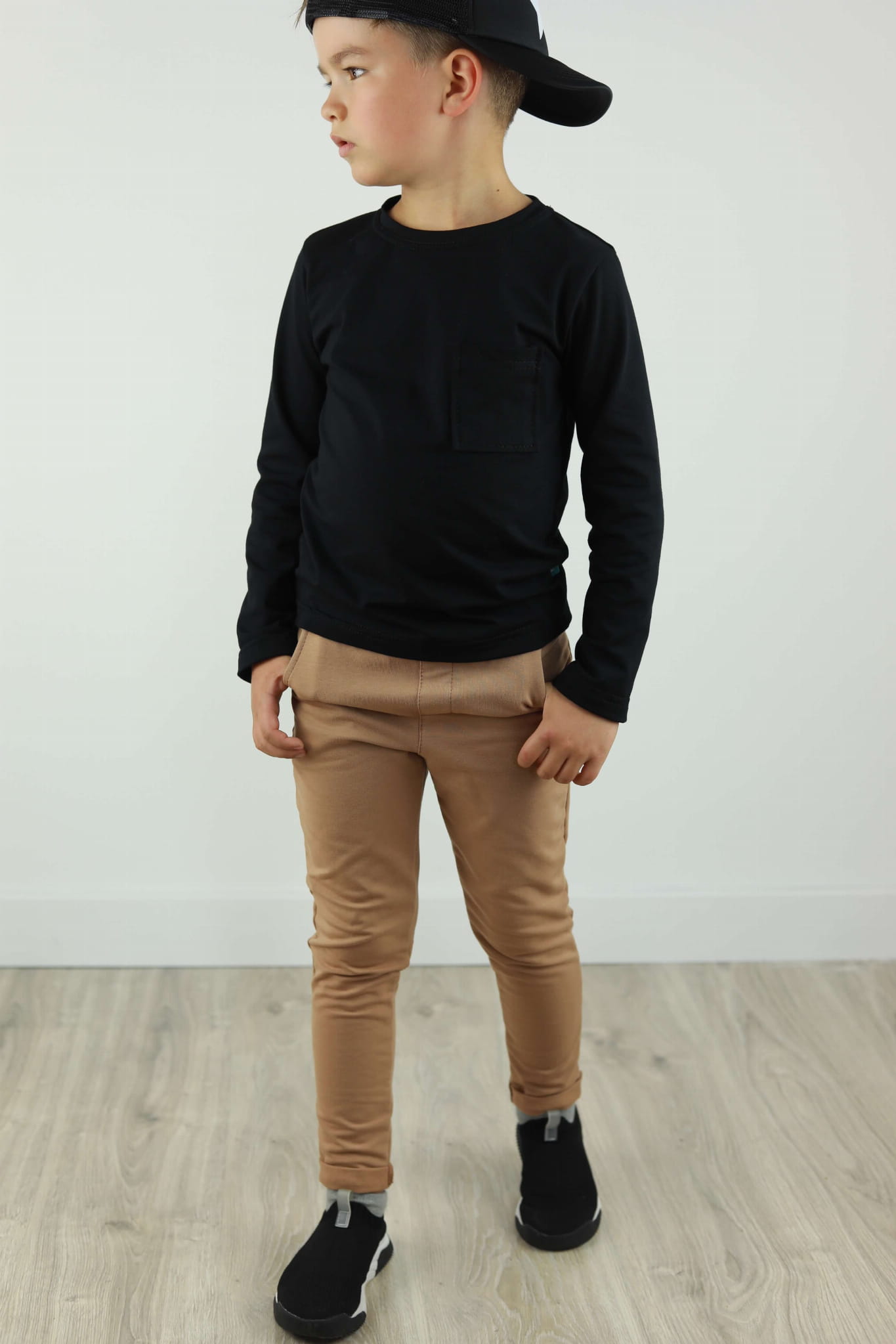 Spodnie RURKI z karczkiem i kieszonką z tyłu, wykończone zabezpieczonym wywinięciem.
